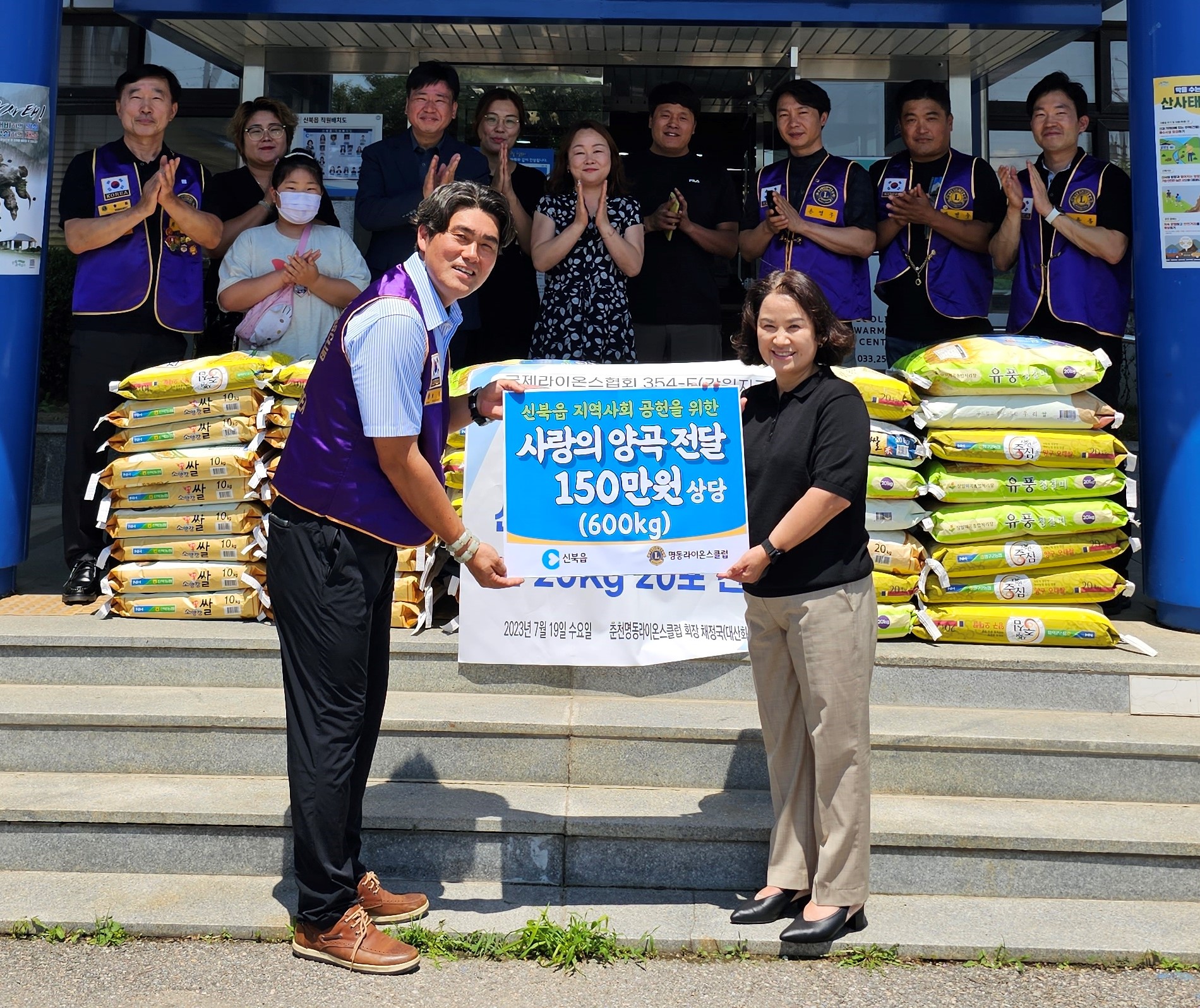 [강원사회복지신문 김도연 기자]=춘천명동라이온스클럽(회장 채정국)은 지난 7월 19일 신북읍행정복지센터(읍장 홍미순)에 방문해 어려운 이웃을 위해 써 달라며 양곡 600kg (150만원 상당)을 전달했다.