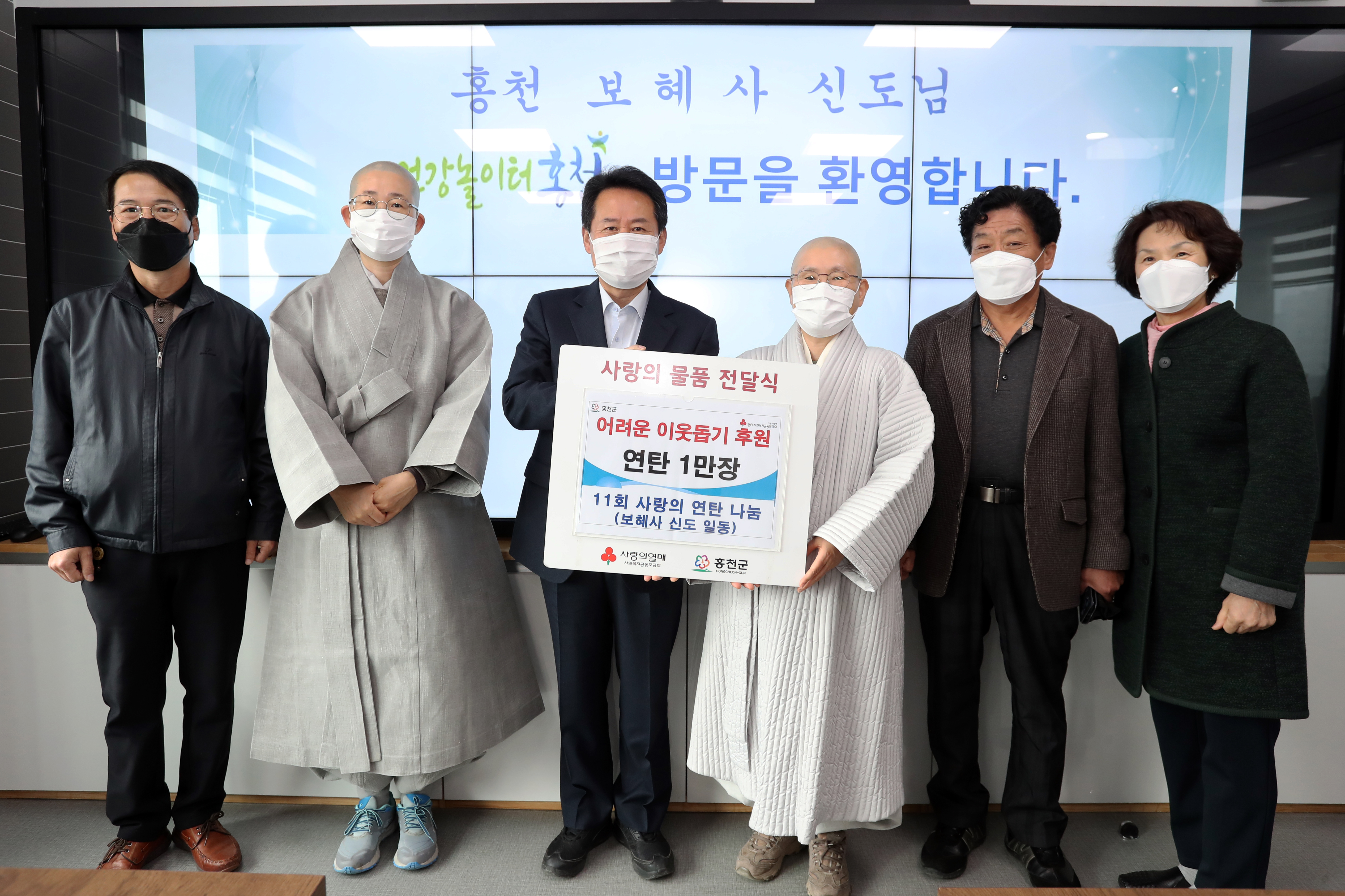 [강원사회복지신문 서은진 기자]=홍천군 홍천읍 보혜사(주지 지만스님)와 신도회(회장 김영구)는 지난 11월 15일 홍천군청을 방문, 지역의 어려운 이웃들에게 전달할 660만원 상당의 연탄 1만장을 기탁했다. 연탄은 홍천군 장애인복지관 추천가구를 포함해 홍천지역 난방 취약계층 20가구에 500장씩 전달될 예정이다. 보혜사...