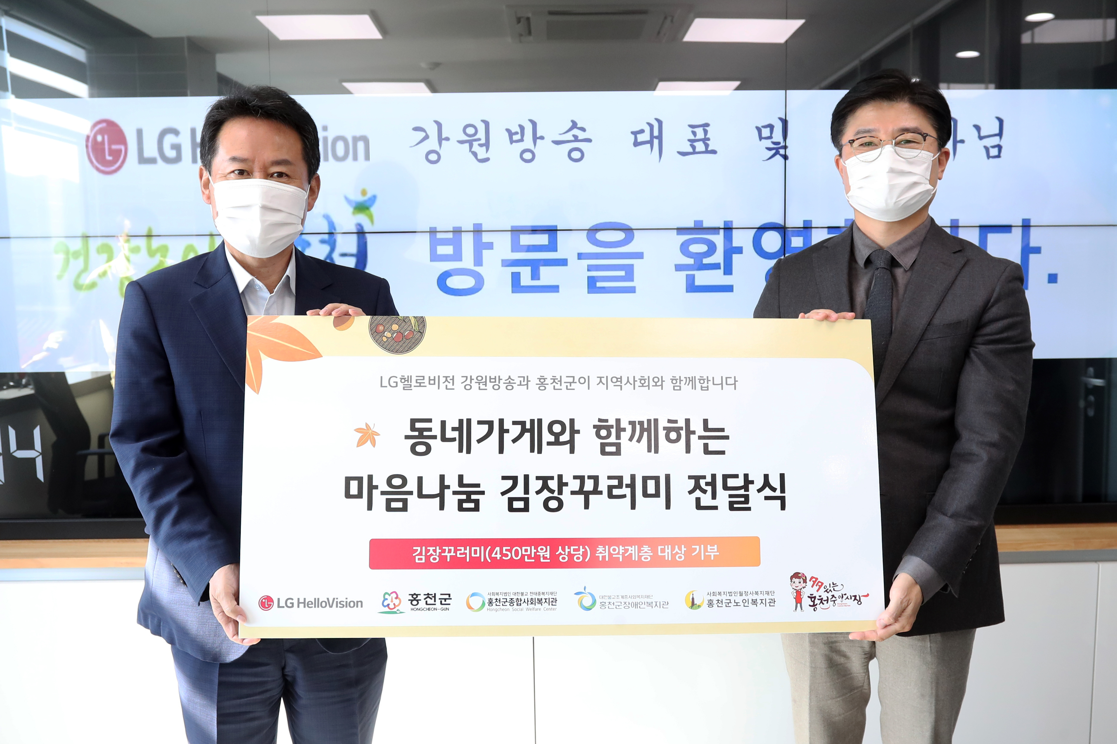 [강원사회복지신문 이정환 기자]=LG헬로비전 강원방송은 지난 10월 28일 홍천군청 군수집무실에서 관내 복지기관 사례관리 취약계층을 대상으로 한 '마음 나눔 김장꾸러미' 전달식을 진행했다. 전달식에는 김성구 LG헬로비전 강원총괄대표와 허필홍 홍천군수, 이병기 홍천중앙시장상인회장, 허종국 홍천군장애인복지관장, 자...
