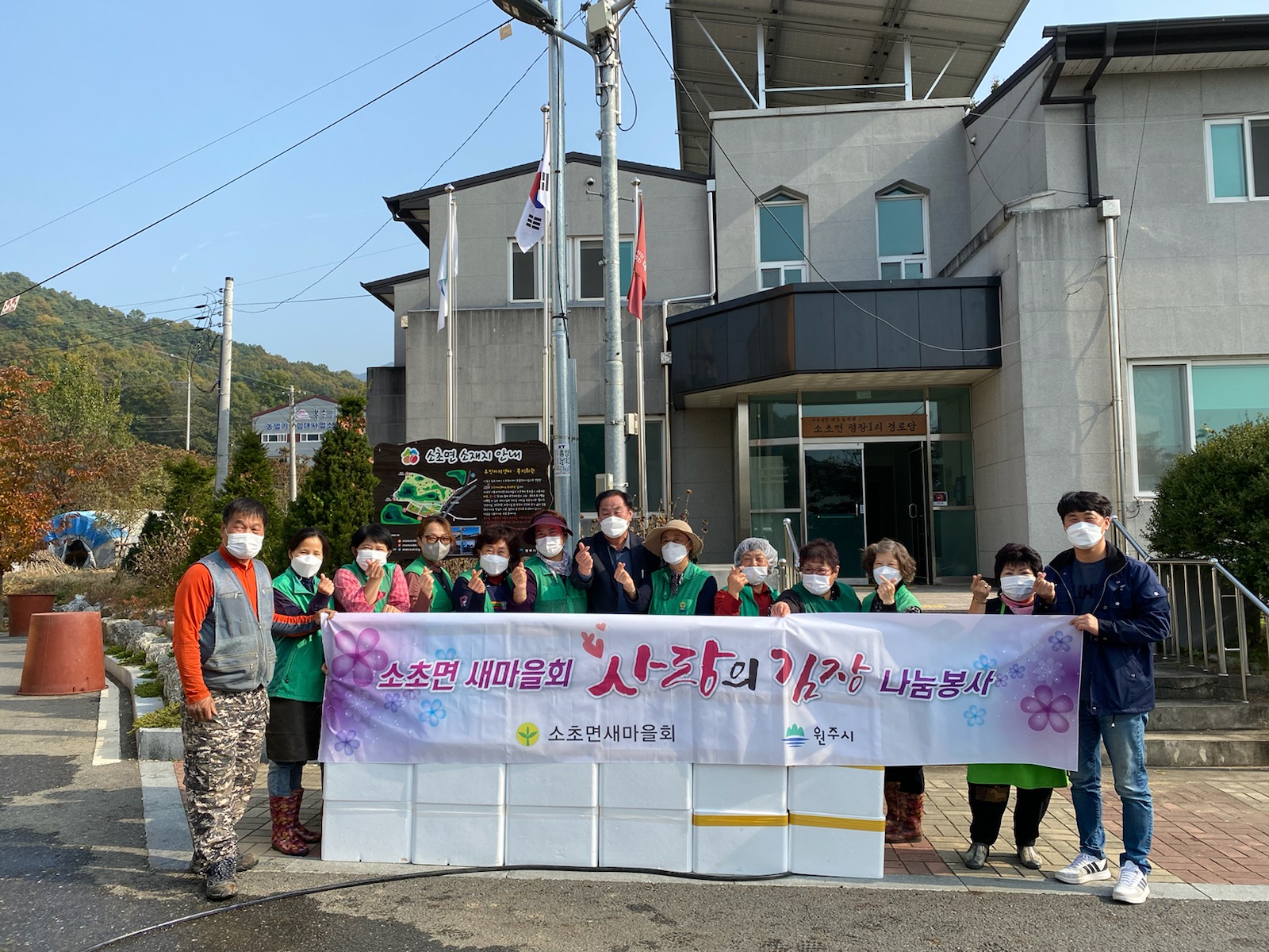 [강원사회복지신문 서은진 기자]=원주시 소초면 새마을회(협의회장 최석우, 부녀회장 최두남)는 지난 10월 26일 사랑의 김장 나눔 봉사에 나서 관내 취약계층 50여 가구에 회원들이 직접 담근 김장김치를 전달하며 따뜻한 이웃사랑을 실천했다. 서은진 기자