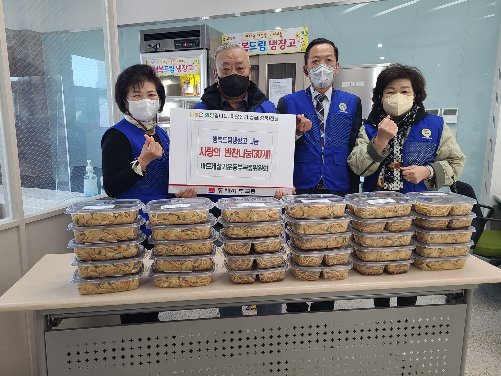 [강원사회복지신문 김종한 기자]=바르게살기운동 부곡동위원회(위원장 최정용)가 회원들이 직접 만든 사랑의 밑반찬 30세트를 동해시 부곡동행정복지센터에 전달했다. 회원들은 함께 밑반찬을 만들어 전달하는 한편, 코로나19 방역활동도 병행해 훈훈함을 더했다. 김재희 부곡동장은 "코로나 19로 어려운 상황에서도 이웃사랑...