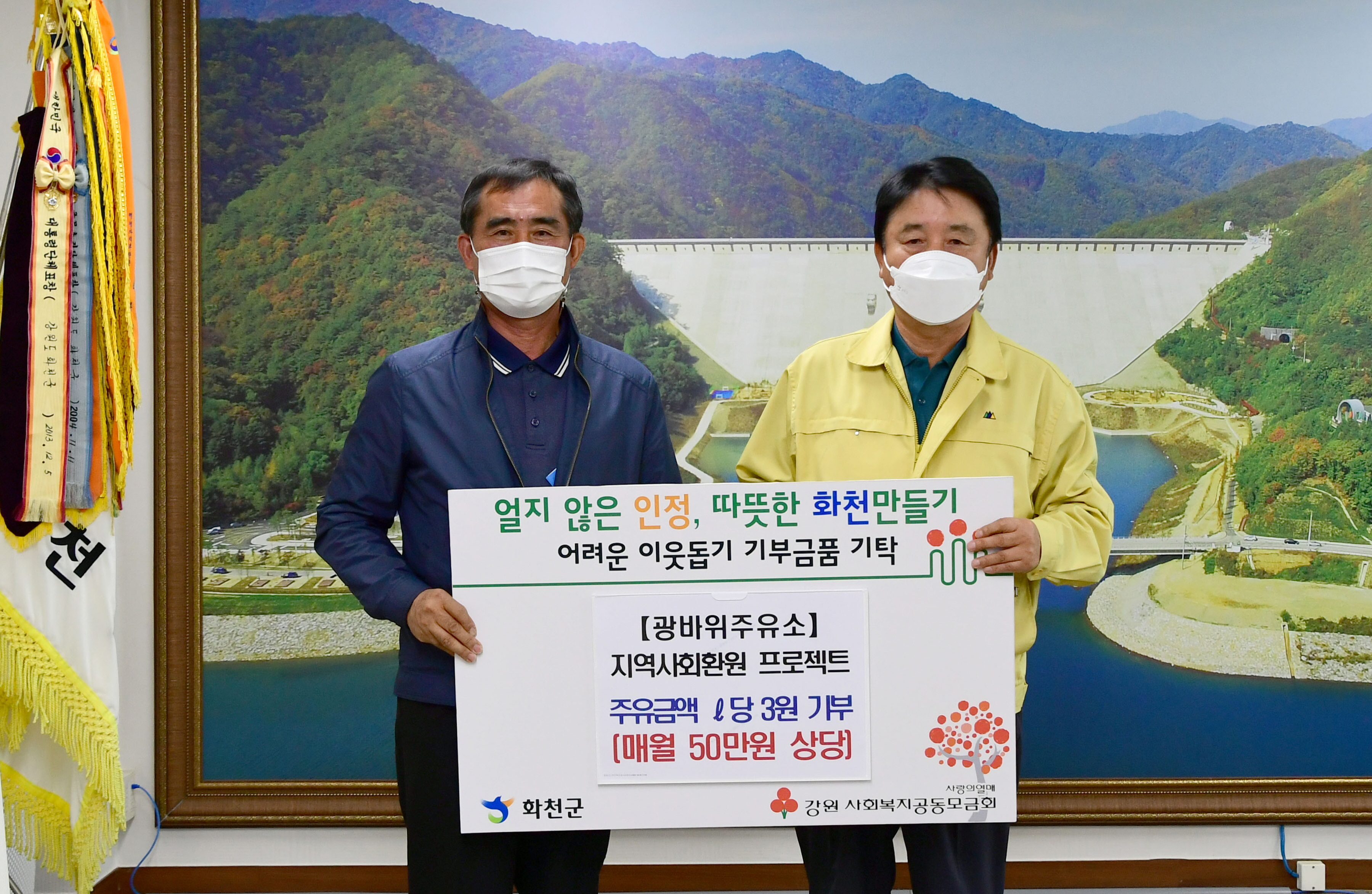 [강원사회복지신문 이정환 기자]=화천군 하남면에서 광바위 주유소를 운영하는 문정직 공동대표는 지난 10월 21일 최문순 화천군수를 방문해 강원사회복지 공동모금회 '얼지 않은 인정, 따뜻한 화천 만들기'사업의 일환으로 매월 1리터 주유금액 당 3원(월 40~50만원 상당)을 기탁키로 약정했다. 광바위 주유소(공동대표:김유...