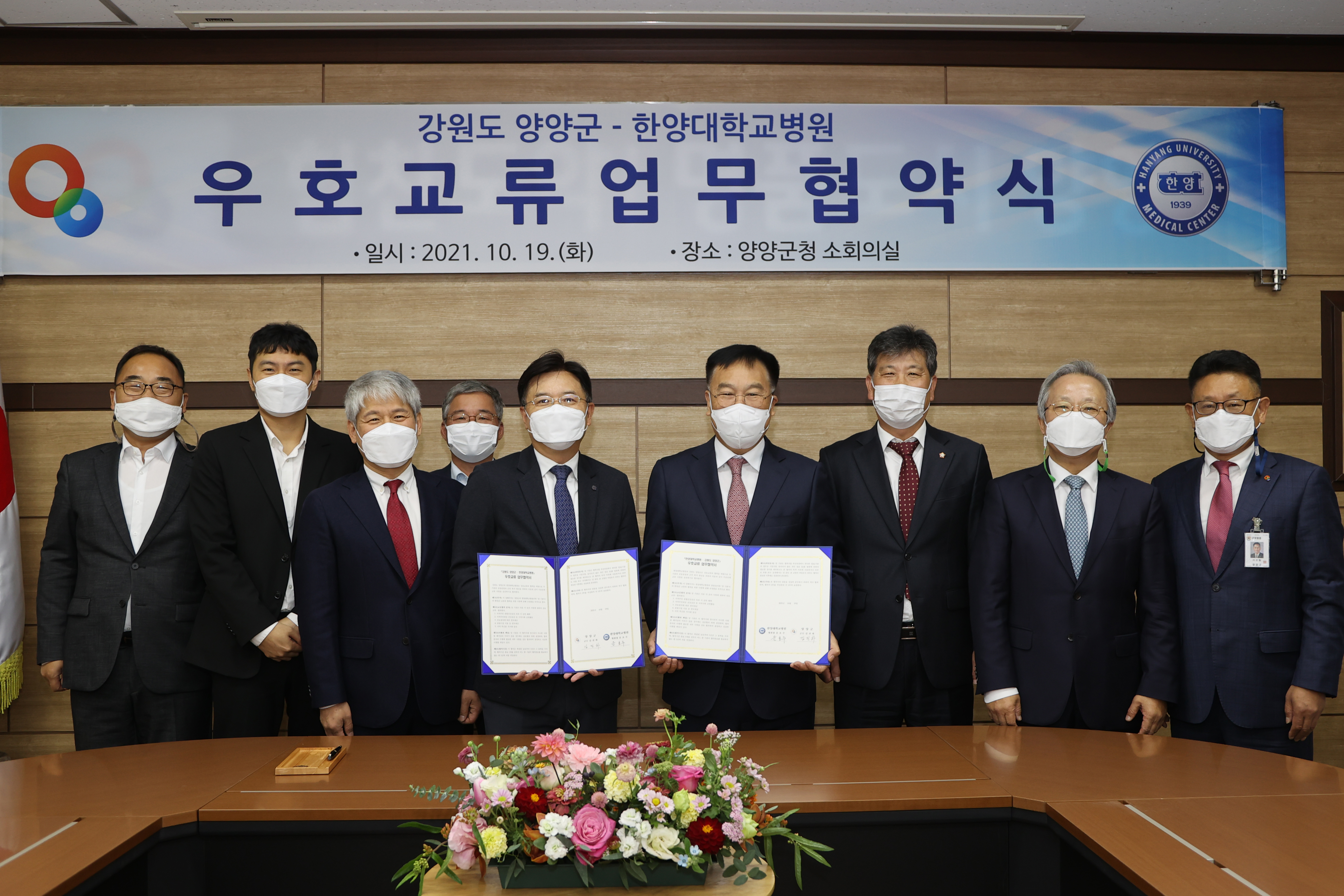 [강원사회복지신문 김종한 기자]=양양군(군수 김진하)이 지난 10월 19일, 양양군청 소회의실에서 한양대학교병원과 우호교류 협약을 체결하고, 본격적인 교류에 들어간다. 이번 교류는 한양대학교병원 병원장을 역임하고, 동대학 의과대학교 외과학 교수로 퇴임한 양양군 권성준 보건소장과 양양군의회 의원의 제안으로 양양...