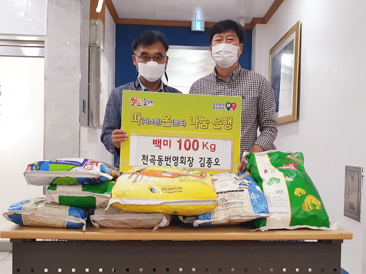[강원사회복지신문 김종한 기자]=동해시 천곡동 번영회장 김종오씨가 지난 10월 12일 천곡동 행정복지센터(동장 김세환)를 방문해 천곡동 저소득층 이웃들을 위해 사용해 달라며 백미 100kg을 기탁했다. 천곡동에서 호야 치킨점을 운영하는 김종오 회장은 평소에도 지역주민을 위한 다양한 봉사활동에 솔선 참여하고 있으며,...