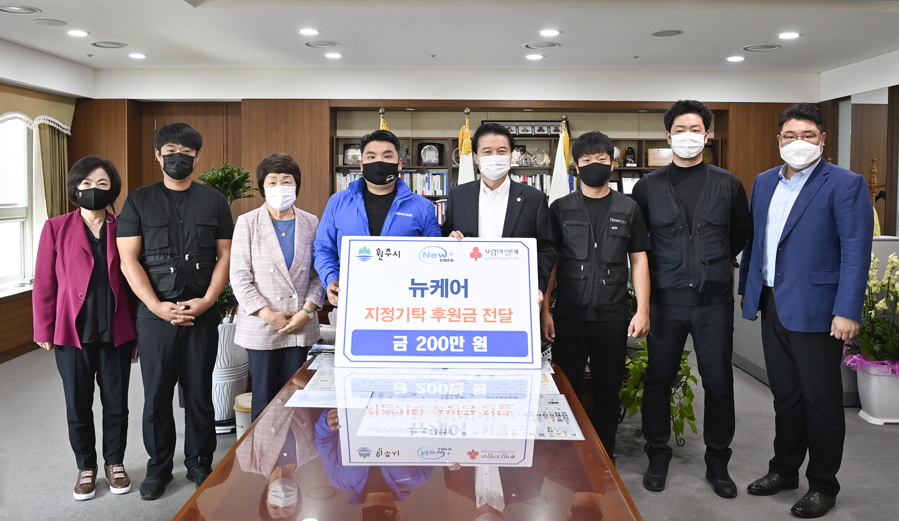 [강원사회복지신문 유경수 기자]=뉴케어(대표 권혁천)는 지난 10월 5일 원주시장 집무실을 방문해 지정기탁 후원금 200만 원을 전달했다. 후원금은 사회복지공동모금회를 통해 원주시 저소득층 또는 사회복지시설에 전해질 예정이다. 한편, 2013년 창립된 뉴케어는 냉난방기 설치 및 판매, 방역소독을 전문으로 하는 청년 기...