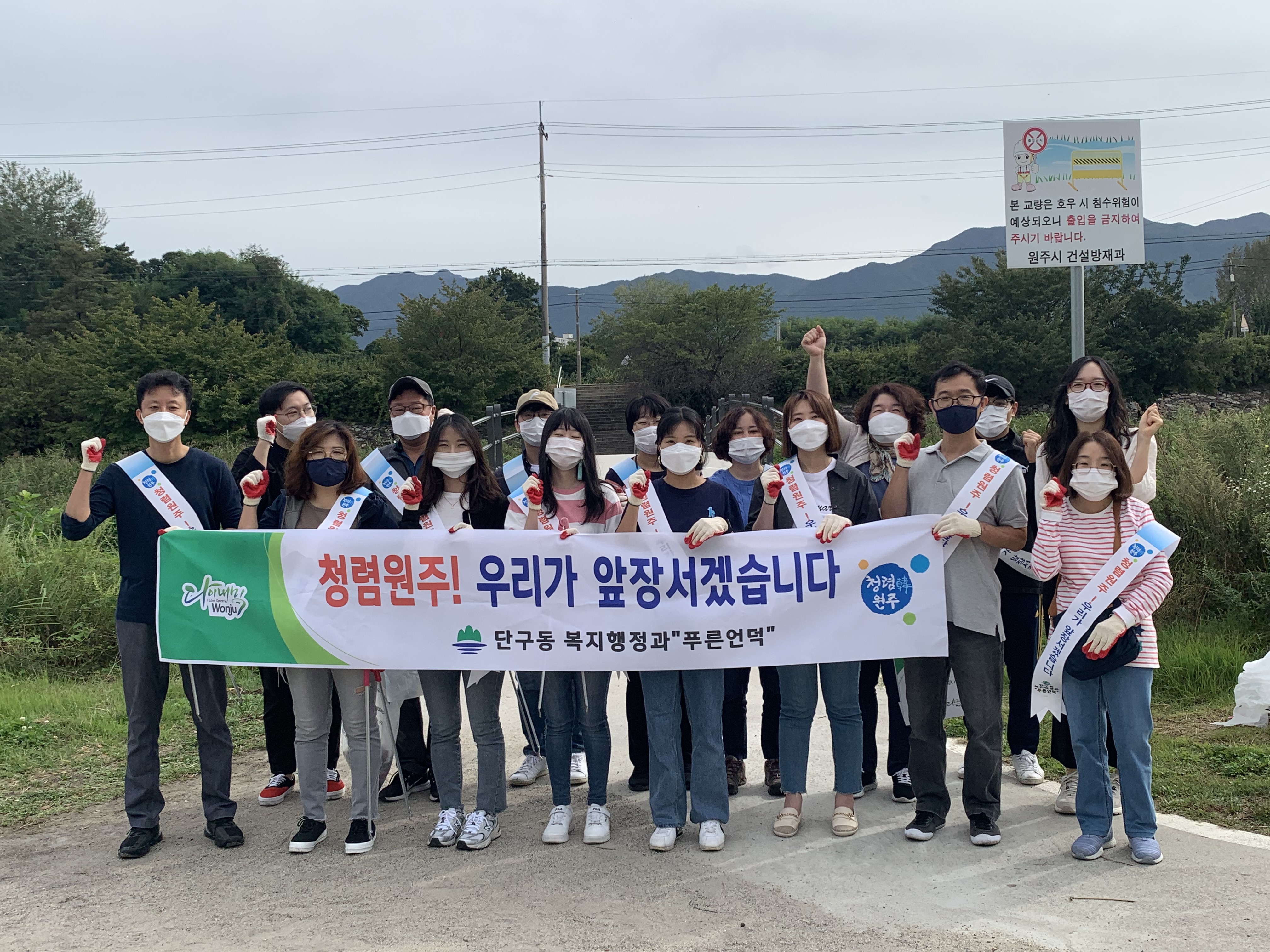 [강원사회복지신문 서은진 기자]=원주시 단구동 복지행정과 청렴 동아리 '푸른언덕'은 지난 10월 4일 원주천 일원에서 쓰레기 수거 및 도로변 청소 등 환경정화 활동과 함께 공직자의 청렴 실천 의지를 알리는 청렴 캠페인을 펼쳤다.