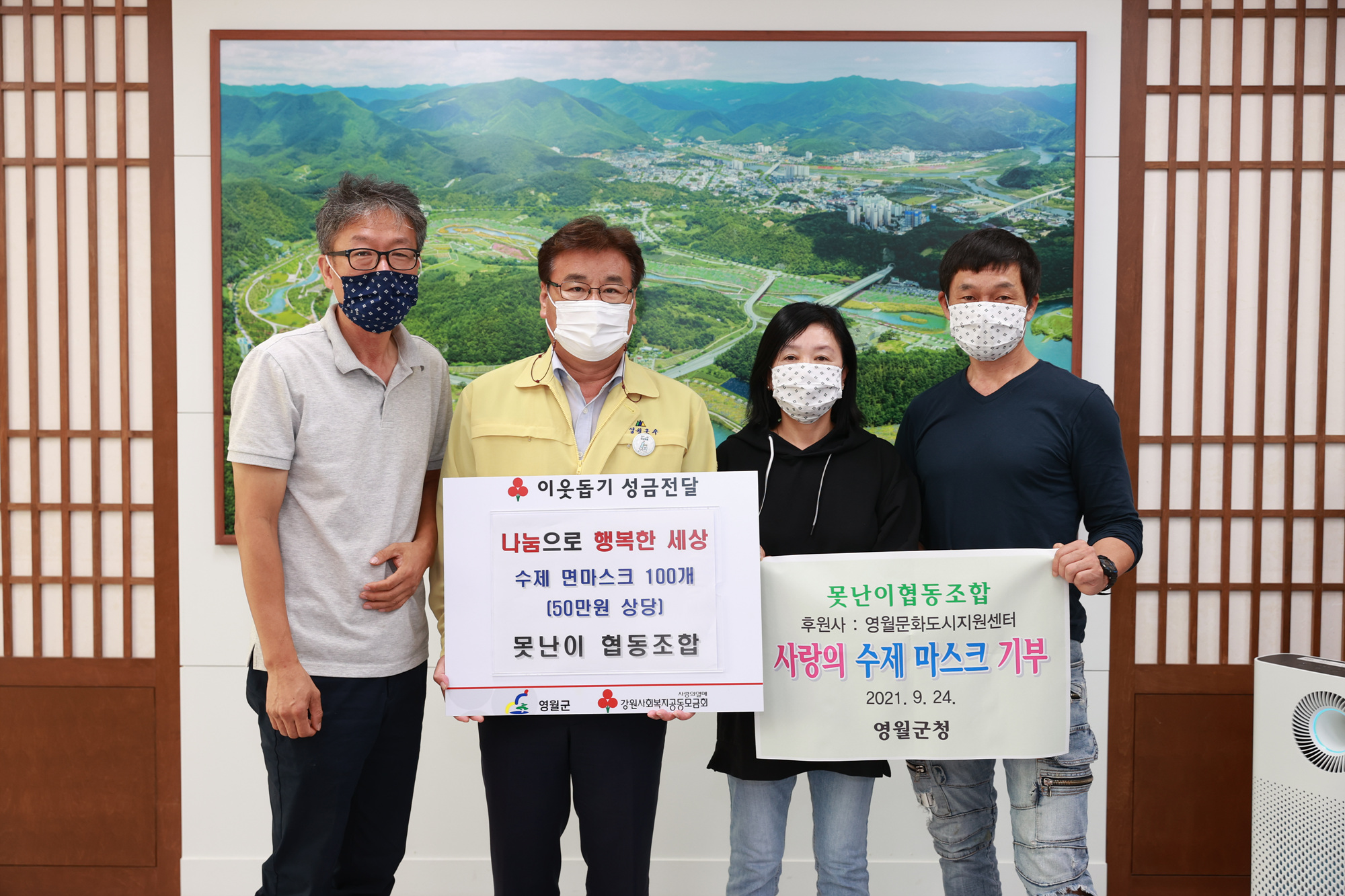 [강원사회복지신문 이정환 기자]=예비 사회적기업 못난이협동조합(대표 한동윤)에서는 지난 10월 5일 50만원 상당 수제 면마스크를 영월군에 기탁했다. 이번 마스크는 영월문화도시추진센터의 후원, 못난이 협동조합 조합원의 자발적 참여로 직접 만든 면마스크 100장이 제작되었다. 기탁자는 "코로나19 장기화로 어려움을 겪...