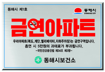 [강원사회복지신문 김종한 기자]=강원도 동해시(시장 심규언)는 평릉동 코아루 디오션 아파트를 동해시 제1호 금연아파트로 지정했다고 밝혔다. 공동주택 금연구역(금연아파트 등) 지정은 '국민건강증진법'에 따라 거주 세대주 1/2이상의 동의를 받아 금연구역 지정을 신청하면 공용공간에 해당하는 복도, 계단, 엘리베이터,...