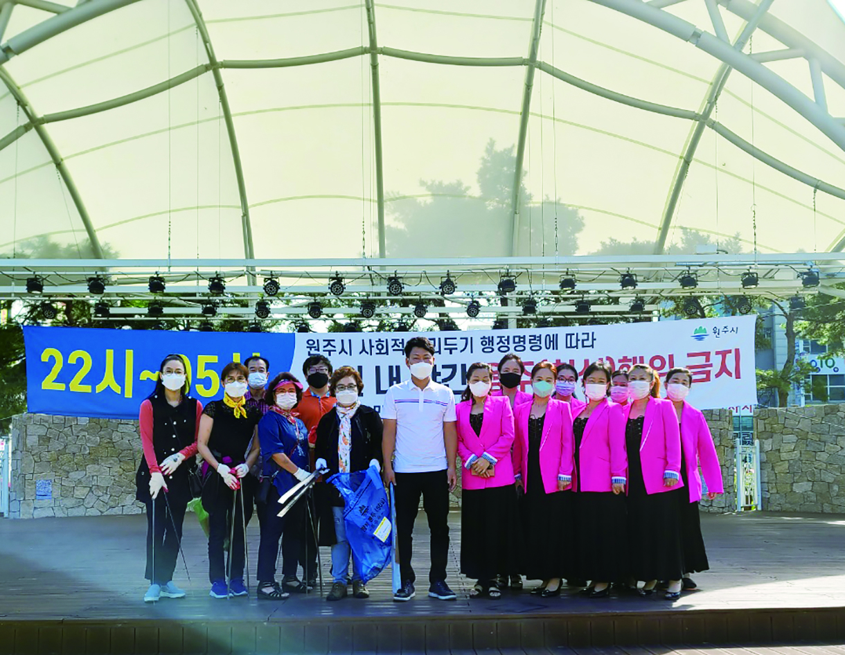 [강원사회복지신문 유경수 기자]='부메랑봉사대(최재석 대장)'는 지난 9월 18일 오전9시 코로나로 힘든 원주시 단계동 상인들을 위로하고자 장미공원 일원에서 환경정화 활동을 벌였다. 오후 10시 이후 집합금지가 된 주변상가로부터 몰려 나온 젊은이들이 장미공원에 모여 밤시간을 보내며 발생한 쓰레기들을 치우는 정화 활...