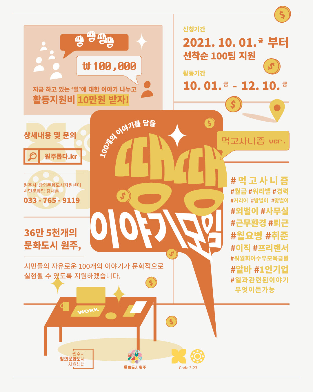 [강원사회복지신문 서은진 기자]=10월부터 12월까지 시민참여자 100팀 모집·운영 원주시 창의문화도시지원센터는 '먹고사니즘'에 대해 자유롭게 이야기를 나누는 00(땡땡)이야기 모임에 참여할 시민 100팀을 모집한다. 모임은 ①월급 받고 일하는 사람 ②월급 주면서 일하는 사람 ③ 월급이 뭐예요? (1인 기업, 프리랜서, 취...