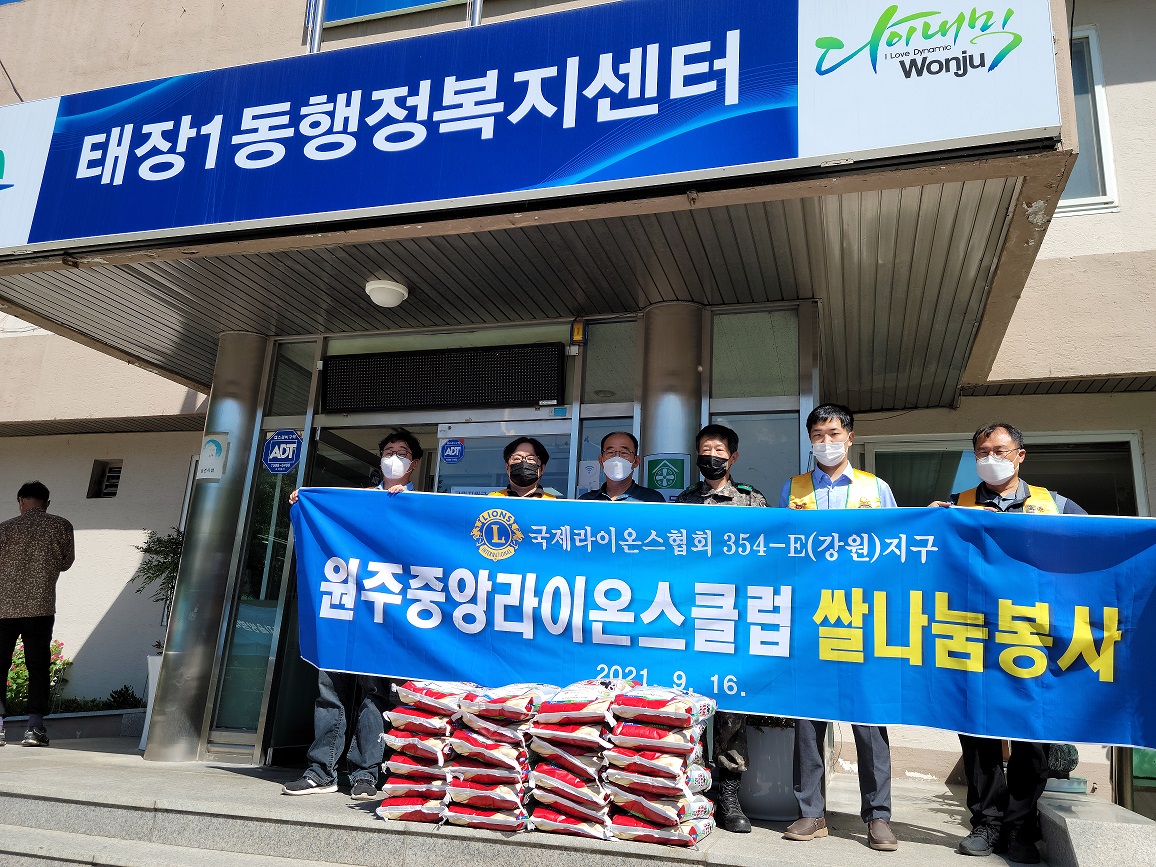 [강원사회복지신문 유경수 기자]=원주중앙라이온스클럽(회장 김기홍)은 지난 9월 16일 추석 명절 저소득 가정 지원을 위해 60만 원 상당의 쌀(10kg) 20포를 원주시 태장1동 행정복지센터에 전달했다.