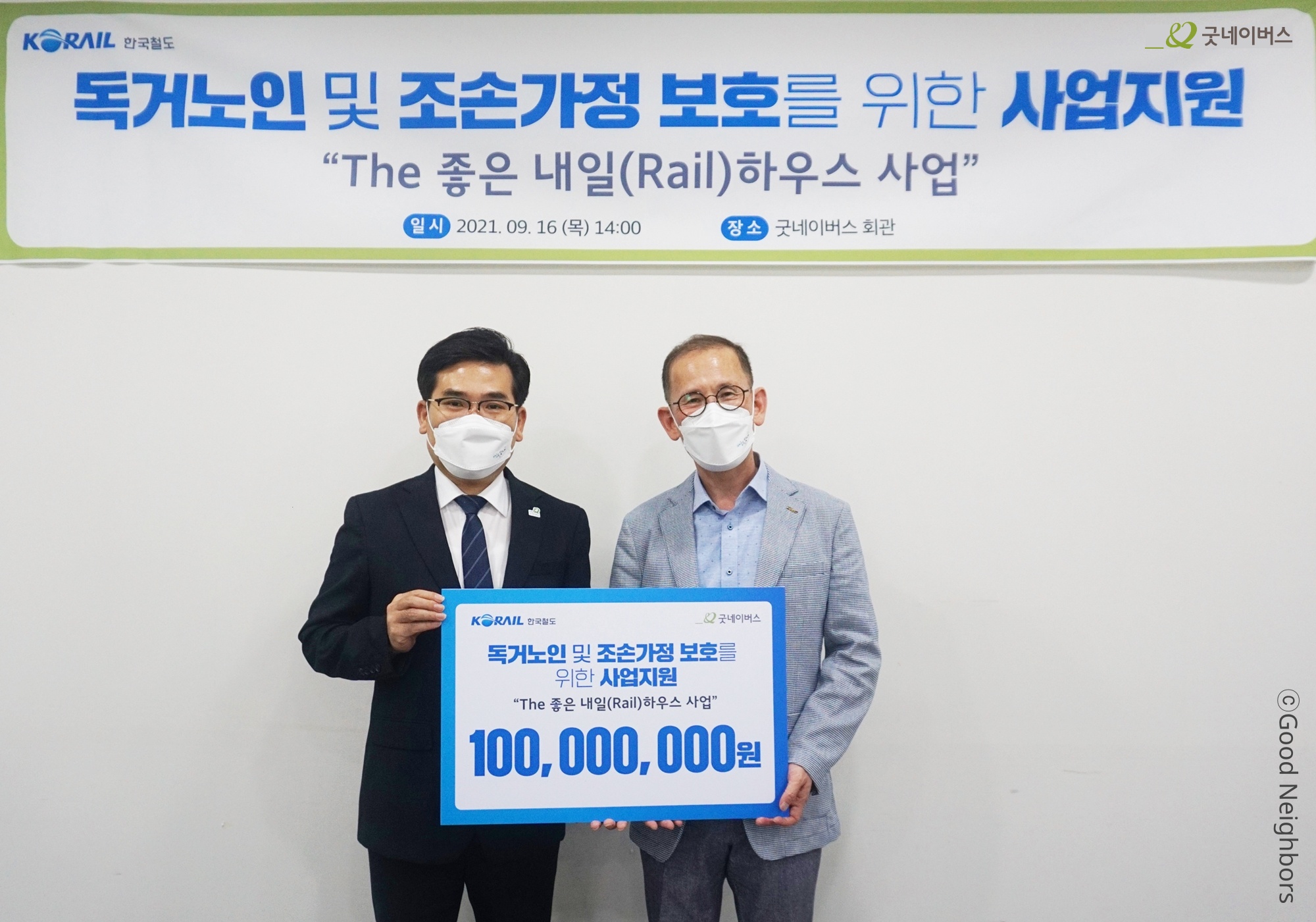 [강원사회복지신문 서은진 기자]=한국철도공사, 독거노인·조손가정 주거환경 개선 위한 1억 원 후원 굿네이버스, The 좋은 내일(rail)하우스 사업 통해 전국 40가정 대상으로 IoT 안전 시스템 설치, 주거환경 개보수 지원 글로벌 아동권리 전문 NGO 굿네이버스는 지난 9월 16일(목) 한국철도공사와 저소득 독거노인·조손가...