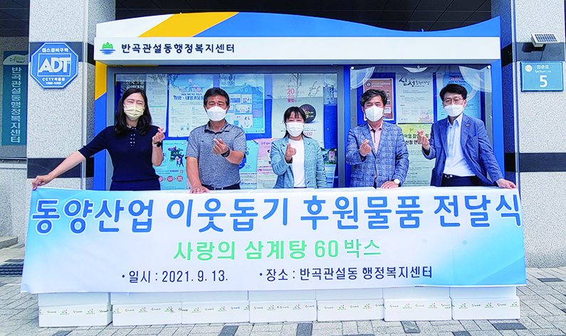 [강원사회복지신문 홍기한 기자]=동양산업(회장 신성숙)은 추석을 맞아 지난 9월 13일 원주시 반곡관설동 행정복지센터(동장 김효중)에 지역 독거노인 등 소외계층을 위한 간편 조리 삼계탕 60박스를 후원했다.