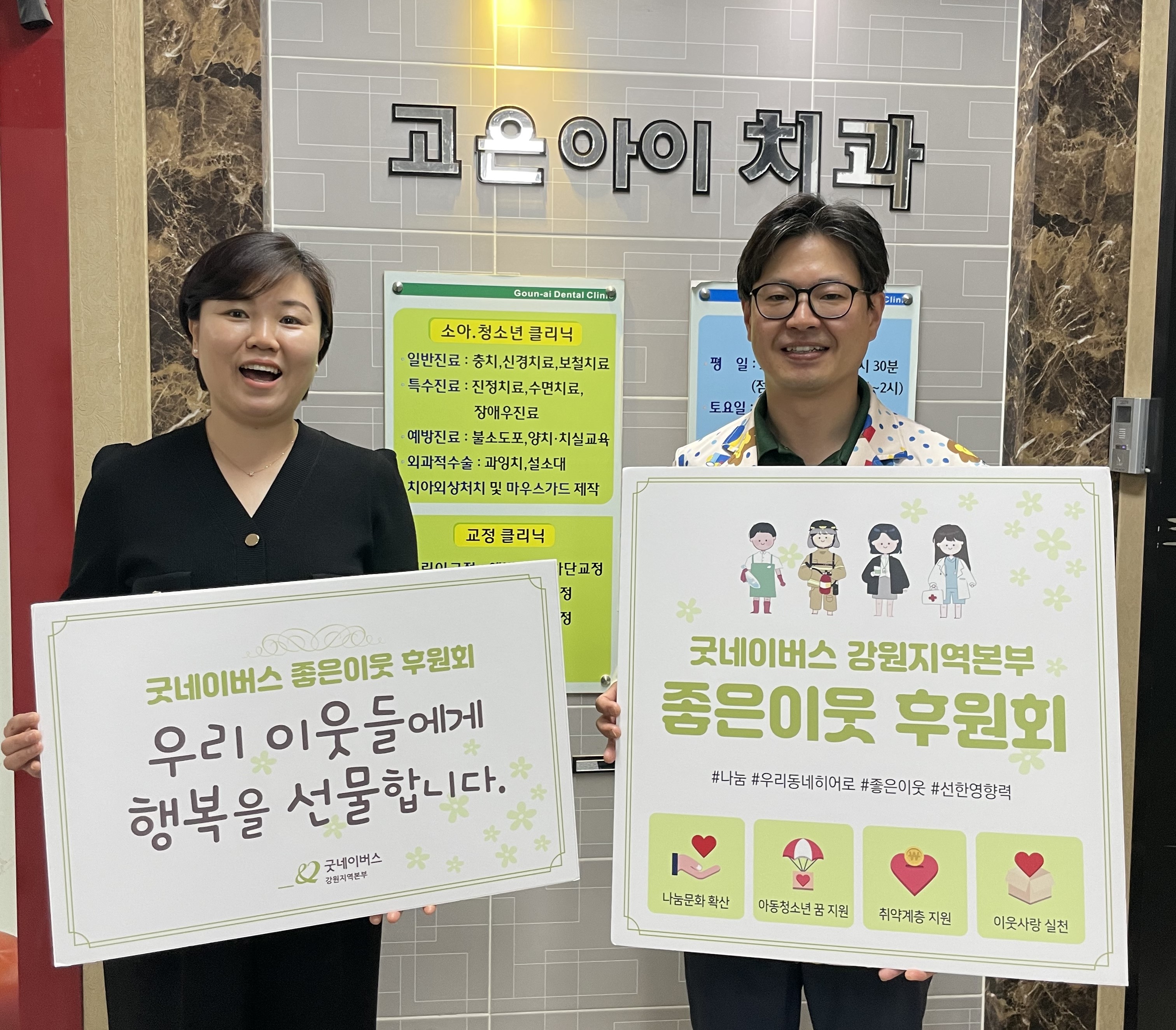 [강원사회복지신문 서은진 기자]=좋은이웃 후원회, 굿네이버스 국내 사업에 후원 및 기획사업 참여 고은아이치과·원주치과·신호드림치과, 강원도 내 취약계층을 위해 좋은이웃 후원회 동참 굿네이버스 강원지역본부(본부장 박미경)와 고은아이치과(원장 박철홍), 원주치과(원장 김영욱), 신호드림치과(원장 김하진)는 강원...