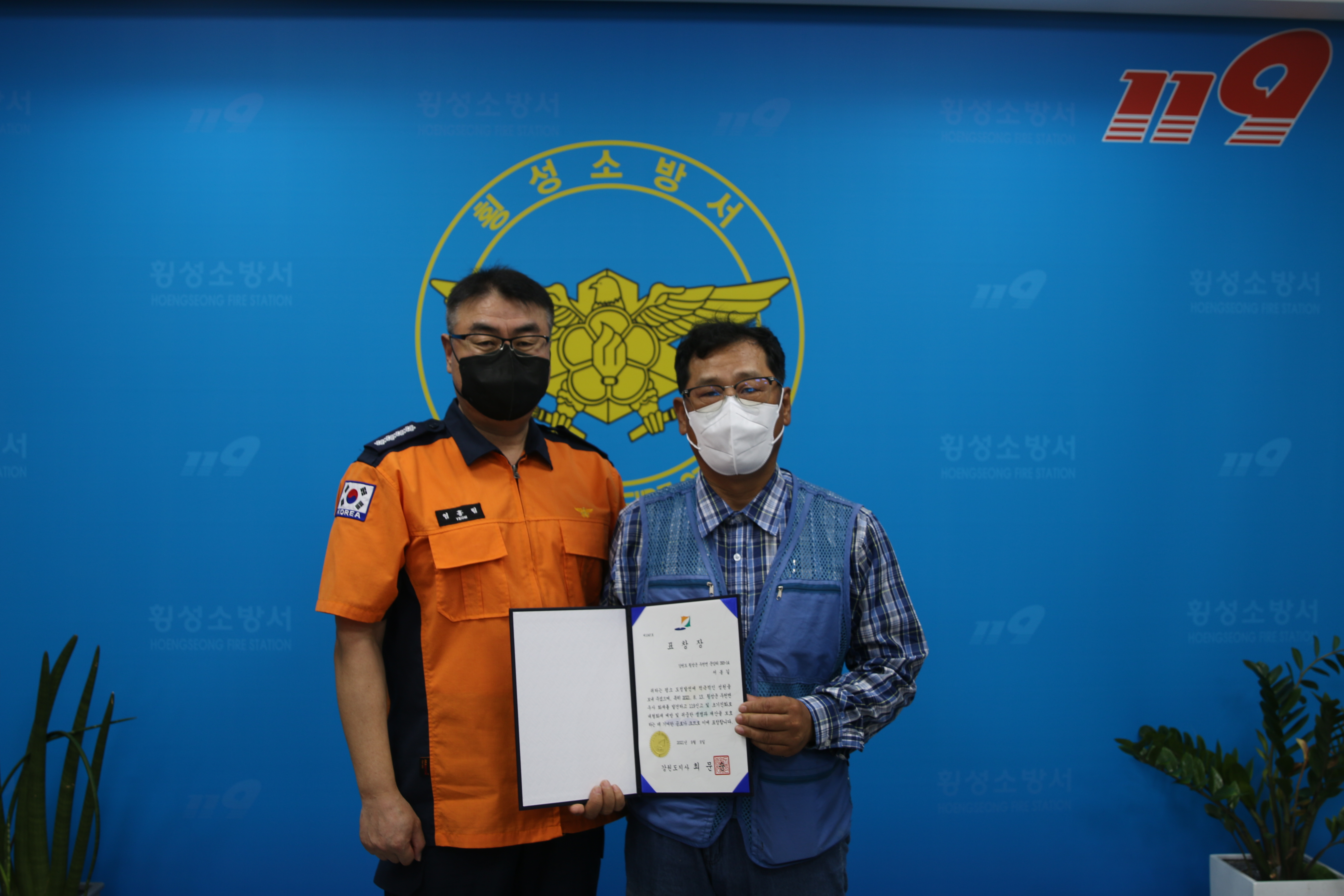 [강원사회복지신문 서은진 기자]=횡성소방서(서장 염홍림)는 지난 9월 9일, 화재 초기 진화에 대한 감사함을 전하는 표창 수여식을 실시했다. 이번 표창 수여식의 주인공인 '서봉길'씨는 지난 8월 13일 우천면 우사에서 연기와 불이 난 것을 발견하고 바로 119에 신고 후 분말소화기와 수돗물을 이용하여 자체 진화하여 큰 피...