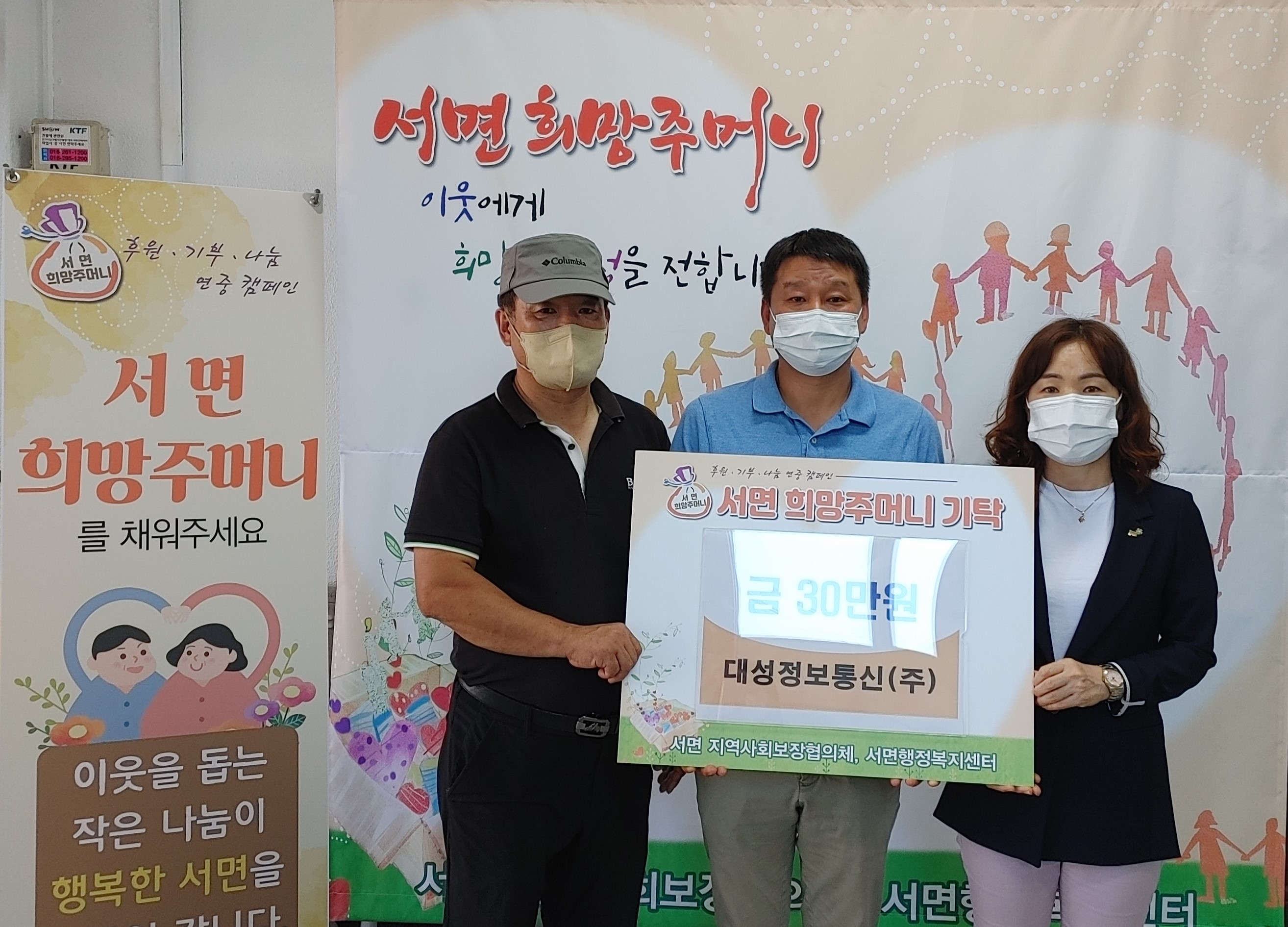 [강원사회복지신문 이정환 기자]=대성정보통신(대표 안희순)은 지난 9월 9일 홍천군 서면 행정복지센터를 방문, 서면 희망주머니에 성금 30만원을 전달했다. 대성정보통신은 평소에도 저소득 홀몸 어르신과 소외계층을 위한 지원을 아끼지 않는 등 지역복지 향상에 앞장서고 있다. 안희순 대표는 "코로나19로 가족들과 함께 ...