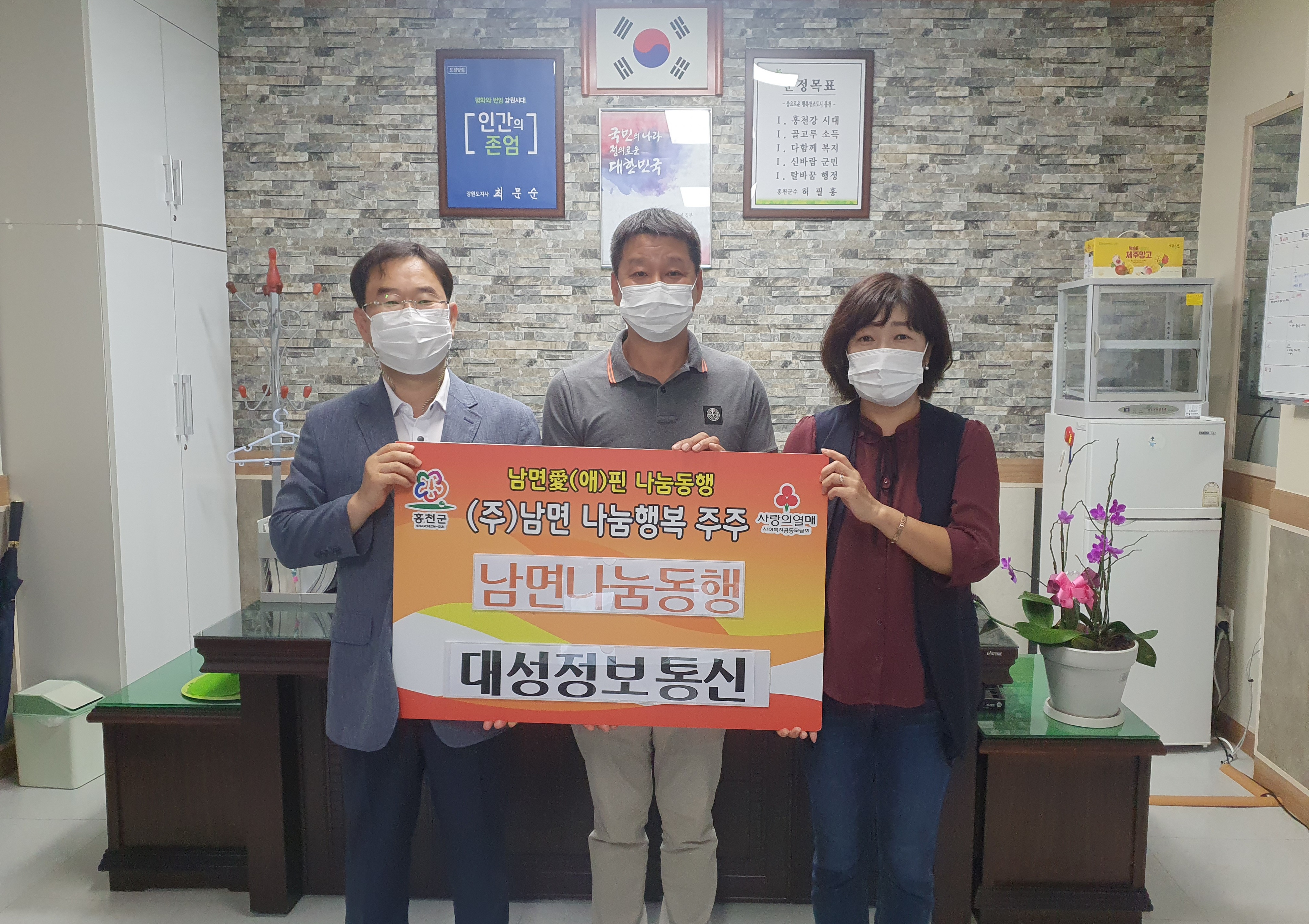 [강원사회복지신문 김종한 기자]=대성정보통신(대표 안희순)은 지난 8월 27일 남면행정복지센터를 방문하여, '남면 나눔행복' 60구좌(1구좌 5,000원)를 후원하였다. 대성정보통신은 남면을 비롯해 관내의 불우이웃을 돕기 위해 지속적으로 후원금을 기탁 하는 등 더불어 사는 따뜻한 지역사회를 만들기 위해 노력하고 있다. ...