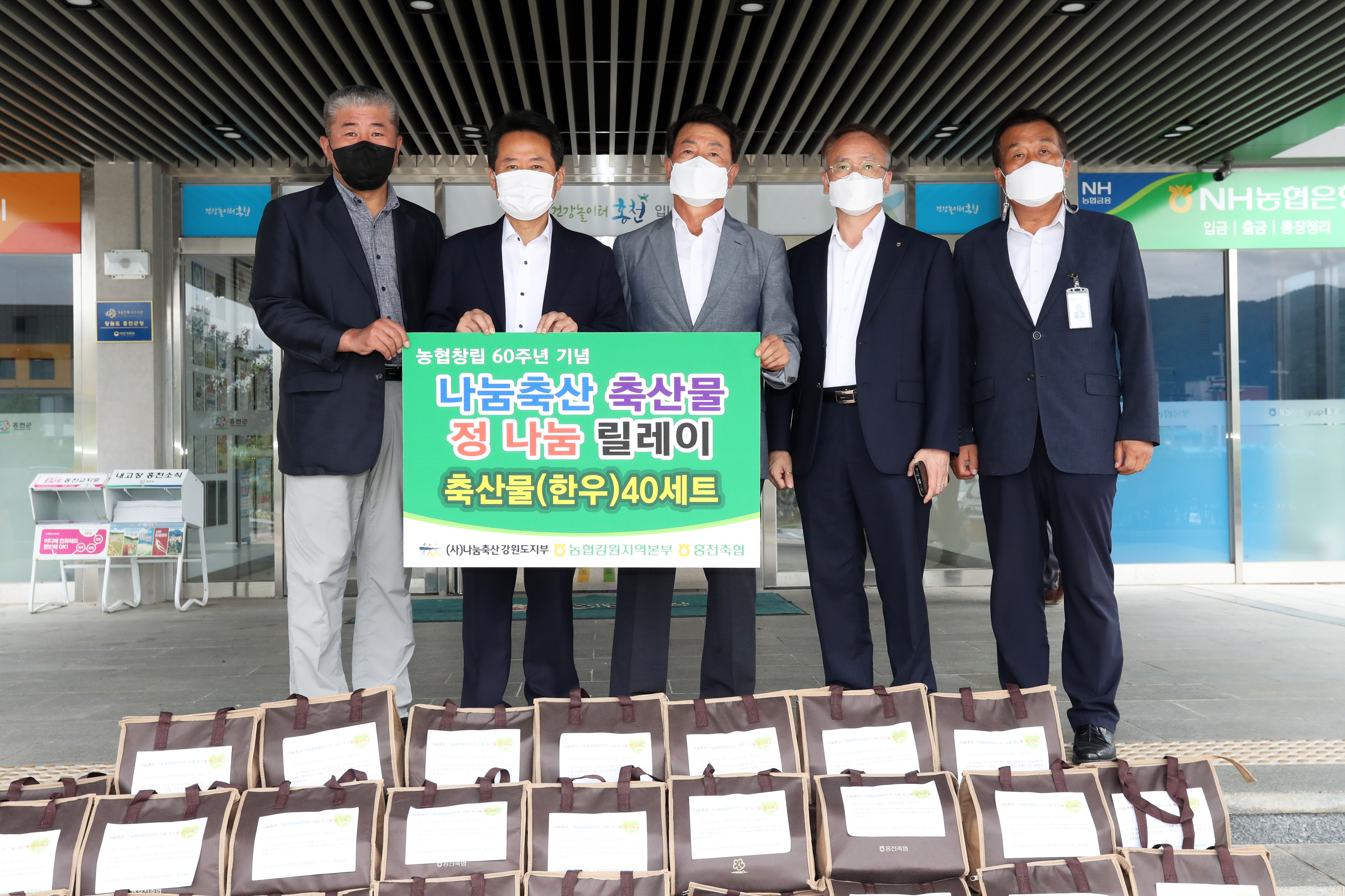 [강원사회복지신문 유경수 기자]=(사)나눔축산운동본부 강원도지부(조합장 김진만)와 홍천축협(조합장 임홍원)은 지난 8월 18일 홍천군청에서 축산물선물세트 40세트를 전달했다. 행사는 '농협창립60주년 기념 축산물나눔행사'의 일환으로 개최됐다. 임홍원 조합장은 "우리 축산물 드시고 무더운 여름 잘 극복하시길 바라는 ...