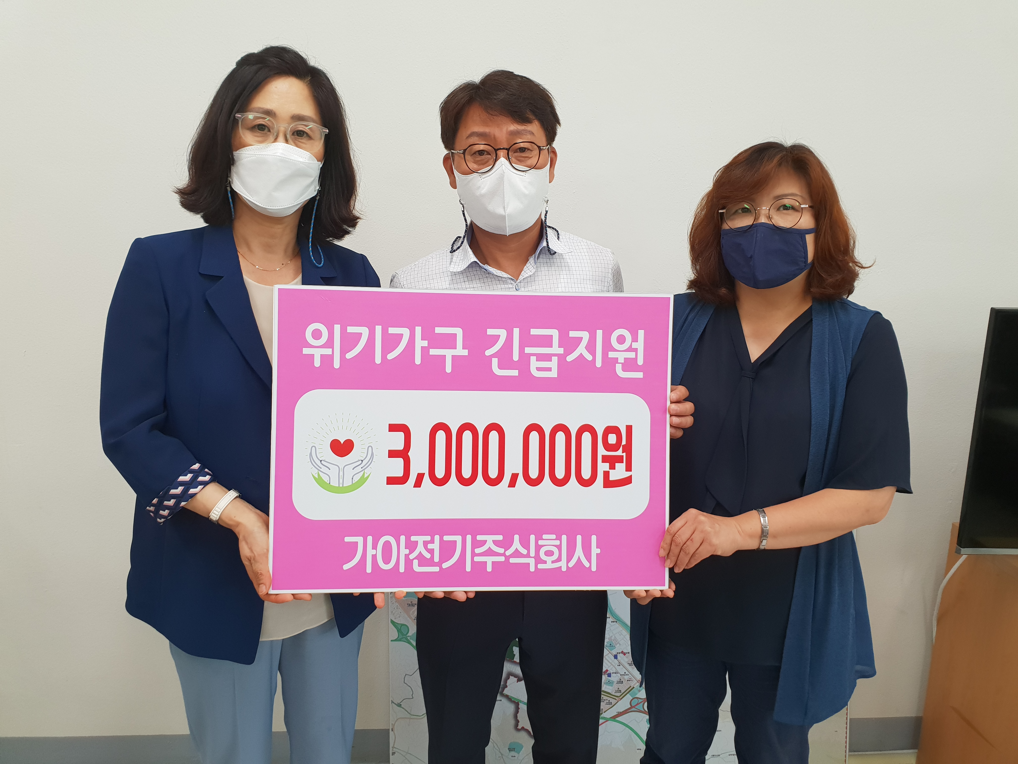 [강원사회복지신문 유경수 기자]=원주태장농공단지 소재 가아전기주식회사(대표 최대식)는 지난 8월 9일 단구동 행정복지센터를 찾아 위기가구 긴급지원을 위한 후원금 300만 원을 전달했다. 후원금은 위기가구 사례관리 대상자를 위한 간병비 및 비급여 의료비 지원, 주거환경 개선 등에 사용할 계획이다.