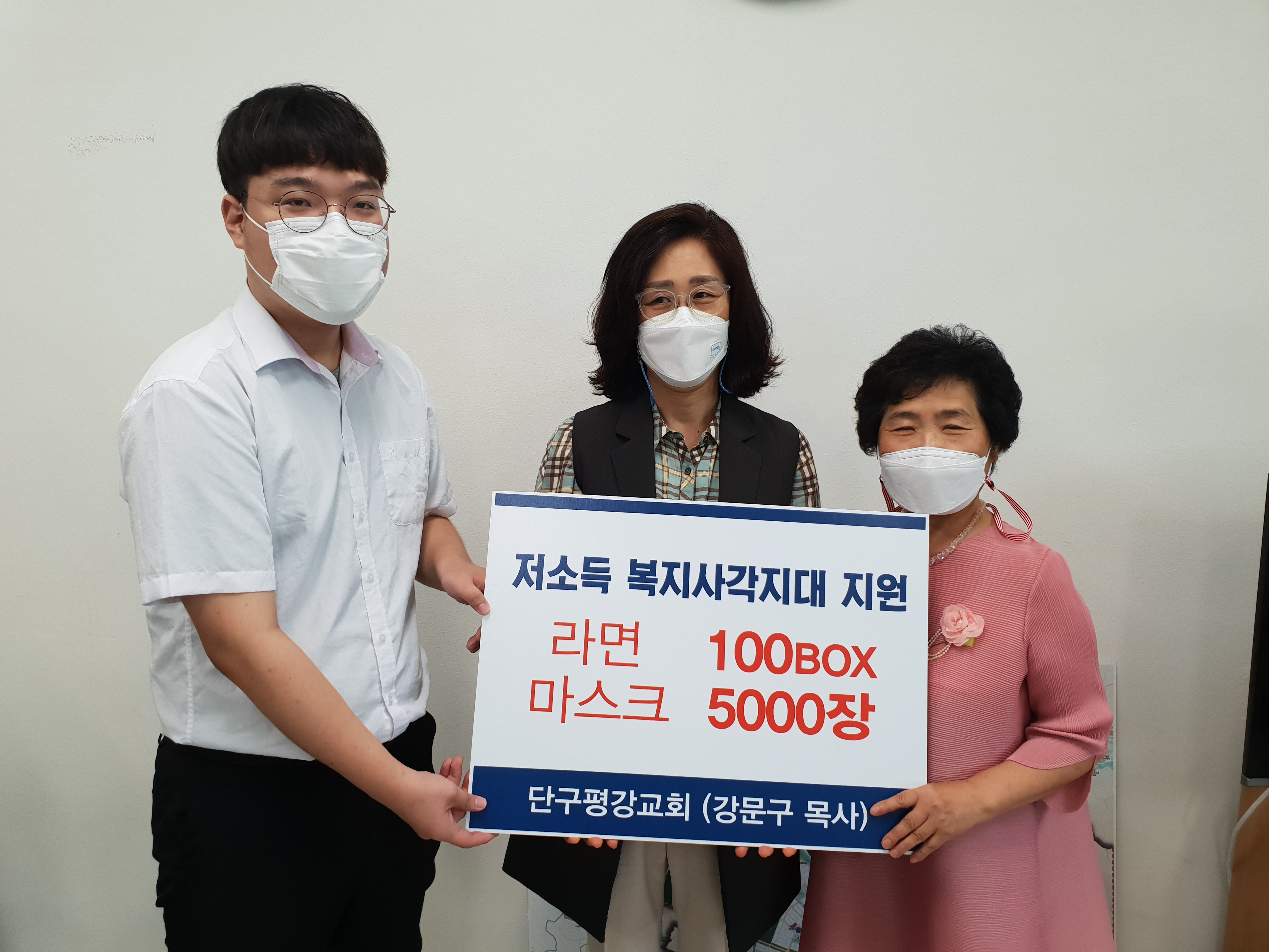 [강원사회복지신문 유경수 기자]=원주시 단구평강교회(강문구 목사)는 지난 7월 28일 저소득 복지사각지대 지원을 위한 라면 100박스와 마스크 5,000장을 원주시 단구동 행정복지센터(동장 박경아)에 전달했다. 후원물품은 지역 저소득층 100가구에 전해질 예정인 가운데, 방문 세대에 대한 모니터링을 통해 위기가정을 발굴...