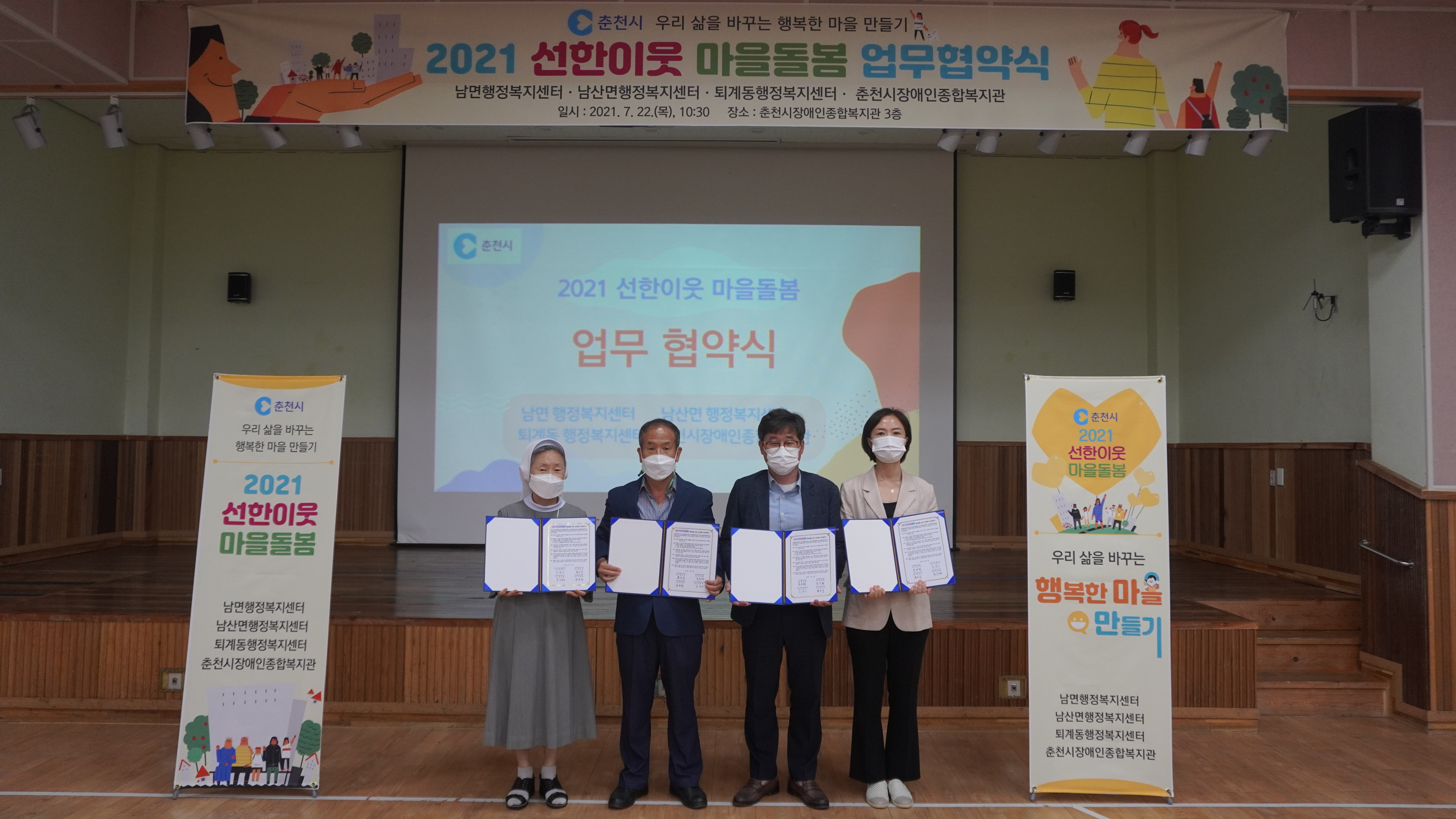 [강원사회복지신문 유경수 기자]=춘천시장애인종합복지관(관장 : 김영미), 남면행정복지센터(면장 : 현은식), 남산면행정복지센터(면장: 용옥현), 퇴계동행정복지센터(동장 : 김상희)는 지난 7월 22일(목) 10:30 춘천시장애인종합복지관 3층 강당에서 '선한이웃 마을돌봄' 사업 업무 협약을 체결했다. 본 협약식은 상호 협력...