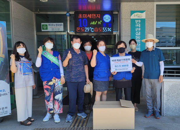 [강원사회복지신문 서은진 기자]=원주시 바르게살기운동반곡관설동위원회(위원장 임월순)는 지난 7월 22일 원주시 반곡관설동 행정복지센터(동장 김효중)에 지역 어르신을 위한 마스크 3,500장을 후원했다. 후원된 마스크는 관내 24개 경로당을 통해 881가구에 전달됐다.