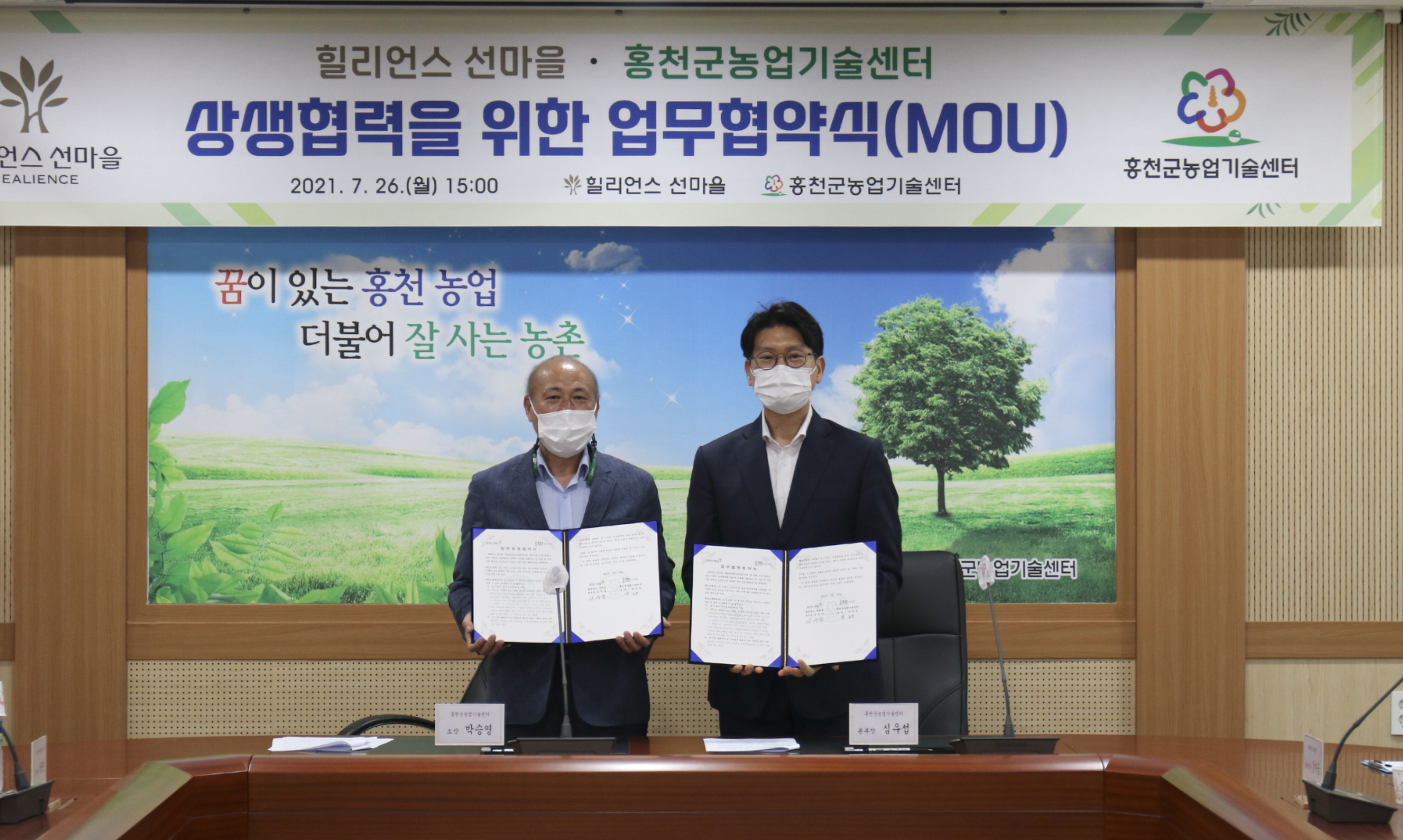 [강원사회복지신문 홍기한 기자]=홍천군 농업기술센터(소장 박승영)는 지난 7월 26일 서면 힐리언스 선마을과 상생협력을 위한 업무협약식을 체결했다. 협약은 홍천 농특산물 홍보(판매)·관광(체험)·교육 등 다양한 분야의 교류 협력을 함께 증진한다는 내용을 담고 있다. 협약식은 박승영 농업기술센터 소장과 힐리언스 선...