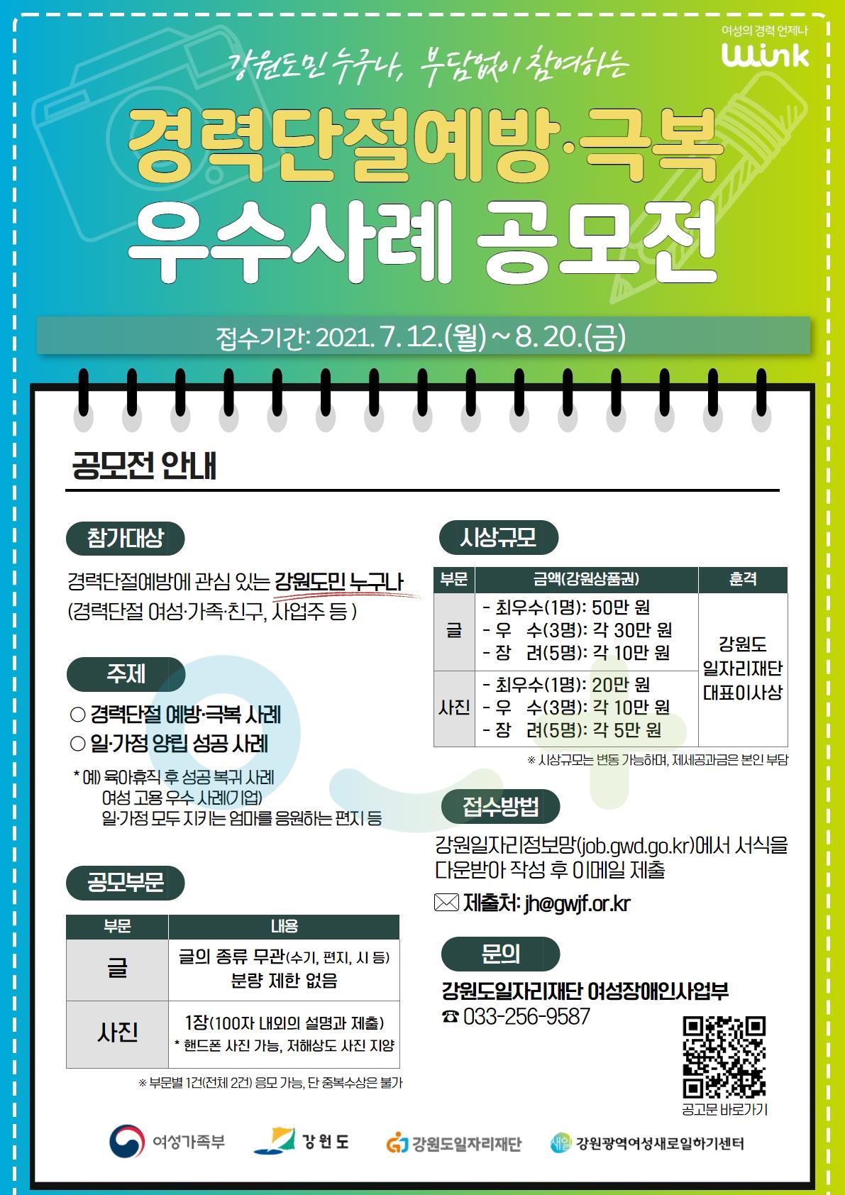 [강원사회복지신문 서은진 기자]=강원도일자리재단이 운영하는 강원광역여성새로일하기센터는 오는 8월 20일까지 경력단절예방·극복 우수사례를 공모한다고 밝혔다. 이번 공모전은 우수사례 공유 및 확산을 통해 여성의 고용유지 지원과 일·생활 균형문화 확산 등을 위해 마련됐으며, 강원도민이라면 누구나 참여 가능하다...