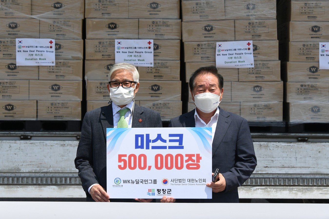 [강원사회복지신문 이정환 기자]=WK뉴딜국민그룹(총장 박항재)는 지난 7월 15일 평창군을 방문해 마스크 50만장을 기증했다. WK국민그룹은 지난 5월 서울 여의도 순복음교회를 통해 마스크 50만장을 이미 기부한 바 있으며, 지금까지 총 112만장을 평창군에 기증했다.