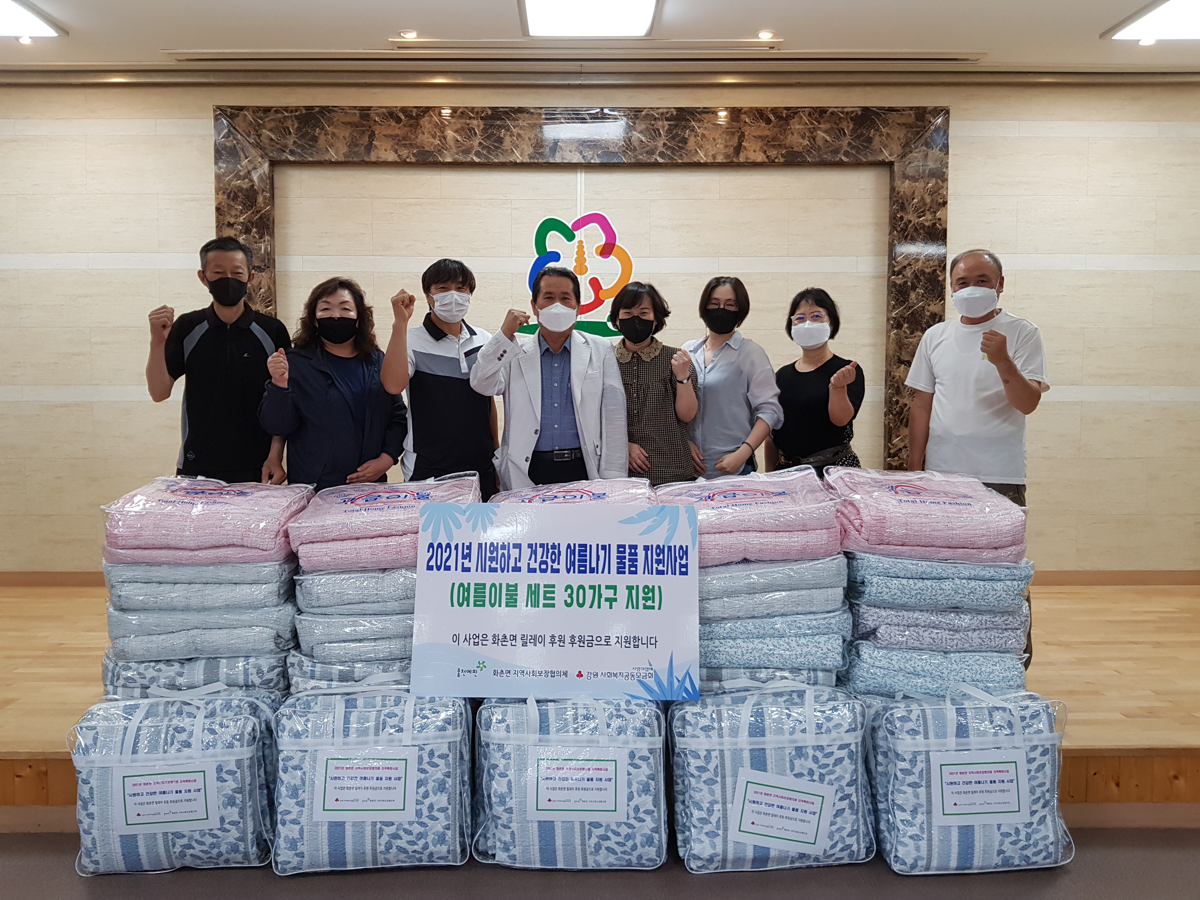 [강원사회복지신문 홍기한 기자]=홍천군 화촌면 지역사회보장협의체(공동위원장 허은숙, 강은수)는 지난 7월 8일 '2021년 시원하고 건강한 여름나기 물품 지원 사업' 전달식을 개최했다. 협의체는 저소득 위기 및 취약계층 30가구에 여름 이불 세트를 전달했다. 재원은 후원문화 확산 프로젝트로 추진 중인 화촌면 릴레이 후...
