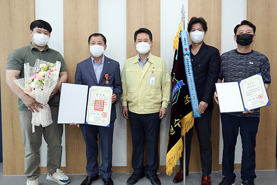 [강원사회복지신문 홍기한 기자]=허필홍 홍천군수는 지난 6월 16일 행정상황실에서 김종삼 홍천군청 건설방재과장에게 2021년 국가재난관리 유공 분야 녹조근정훈장을 전수했다. 또 국가재난관리 분야 발전에 기여한 공로로 홍천수난구조대에 국무총리 표창장을 전수했다. 사진은 왼쪽부터 이태호 홍천수난구조대 재무, 김종...