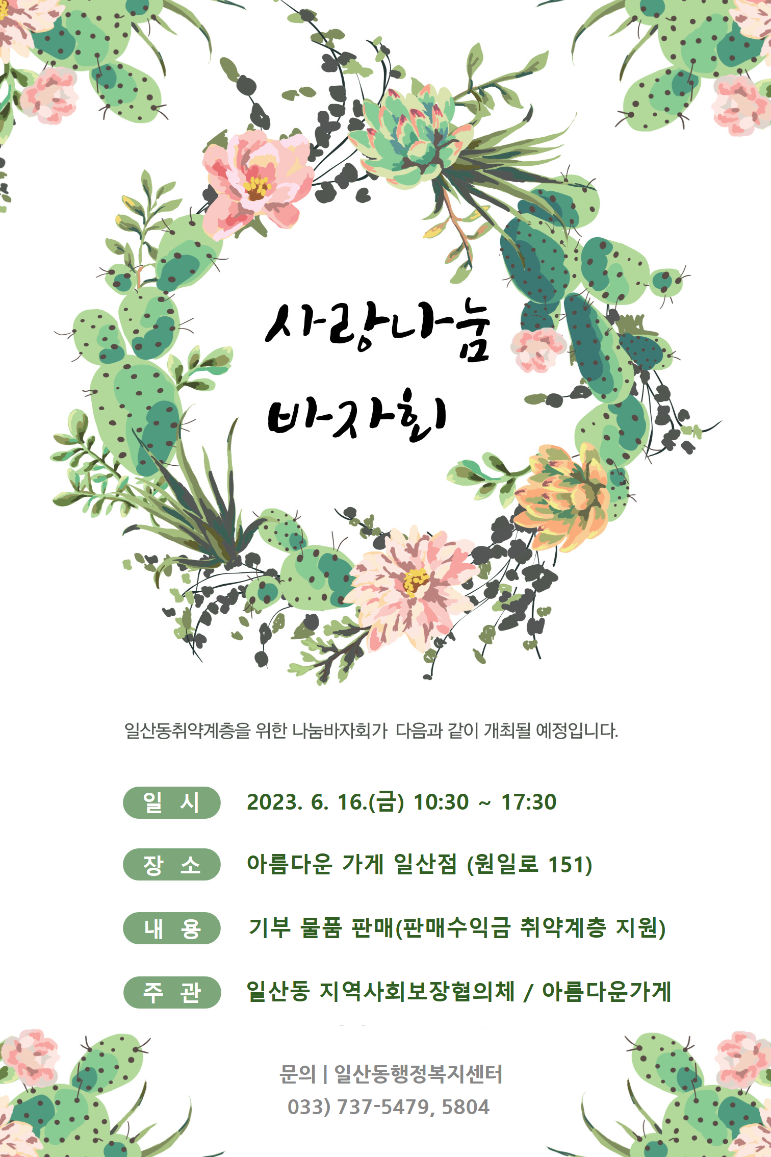 [강원사회복지신문 김도연 기자]=원주시 일산동지역사회보장협의체와 아름다운 가게는(위원장 황명흠)는 오는 6월 16일 아름다운가게 일산점에서 사랑 나눔 바자회를 개최한다. 이를 위해 일산동 찾아가는 보건복지팀과 협의체 위원들은 지난 4월부터 관내 공동주택을 돌며 재사용이 가능한 물품을 기부받았다. 이날 바자회에...