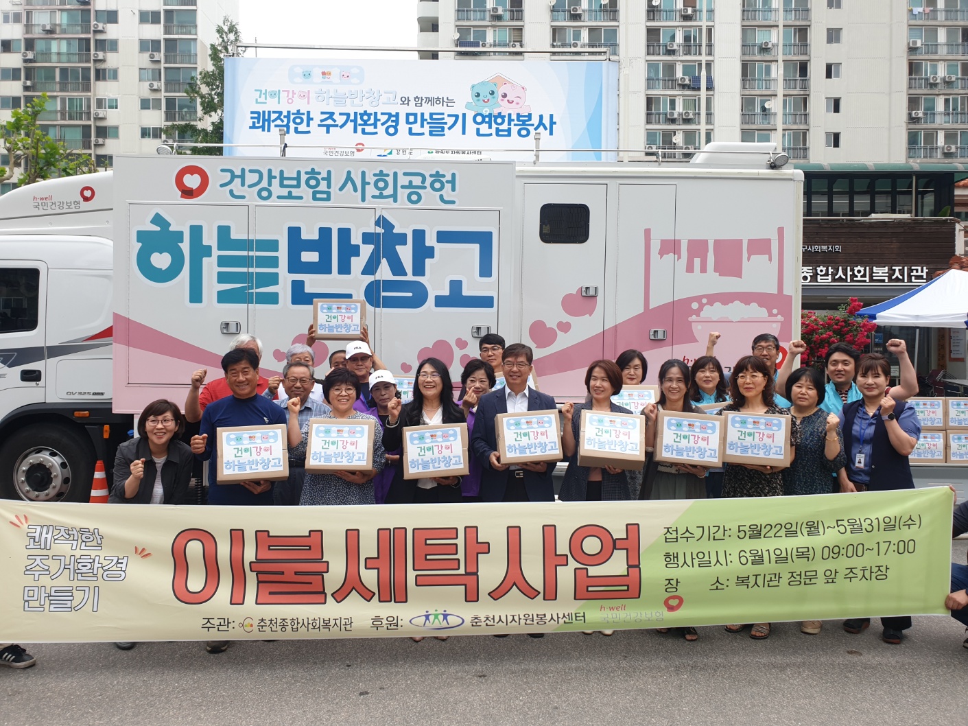 [강원사회복지신문 서은진 기자]=춘천종합사회복지관(관장 오미경)은 지난 6월 1일(목) 춘천종합사회복지관 일대에서 지역주민의 쾌적한 주거환경 만들기를 위하여 이불세탁을 진행하였다. 이번 행사는 춘천시자원봉사센터, 건강보험공단과 함께 진행하였으며 이불세탁을 통하여 주거환경을 개선하는 의미 있는 시간이 되었다...