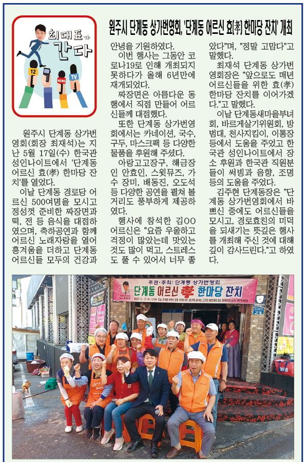 [강원사회복지신문 김종한 기자]=관내 85세 이상 저소득 독거어르신 16명 생신서비스 "어르신 안녕하세요!" 청소년 2명, 어르신 1명, 협의체위원 1명이 조를 이루어 8회기 이상, 프로그램 실시 동해시 북삼동 지역사회보장협의체(민간위원장 한명희, 공공위원장 황복순)는 지난 5월 31일 무릉건강숲에서 어르신&청소년 결...