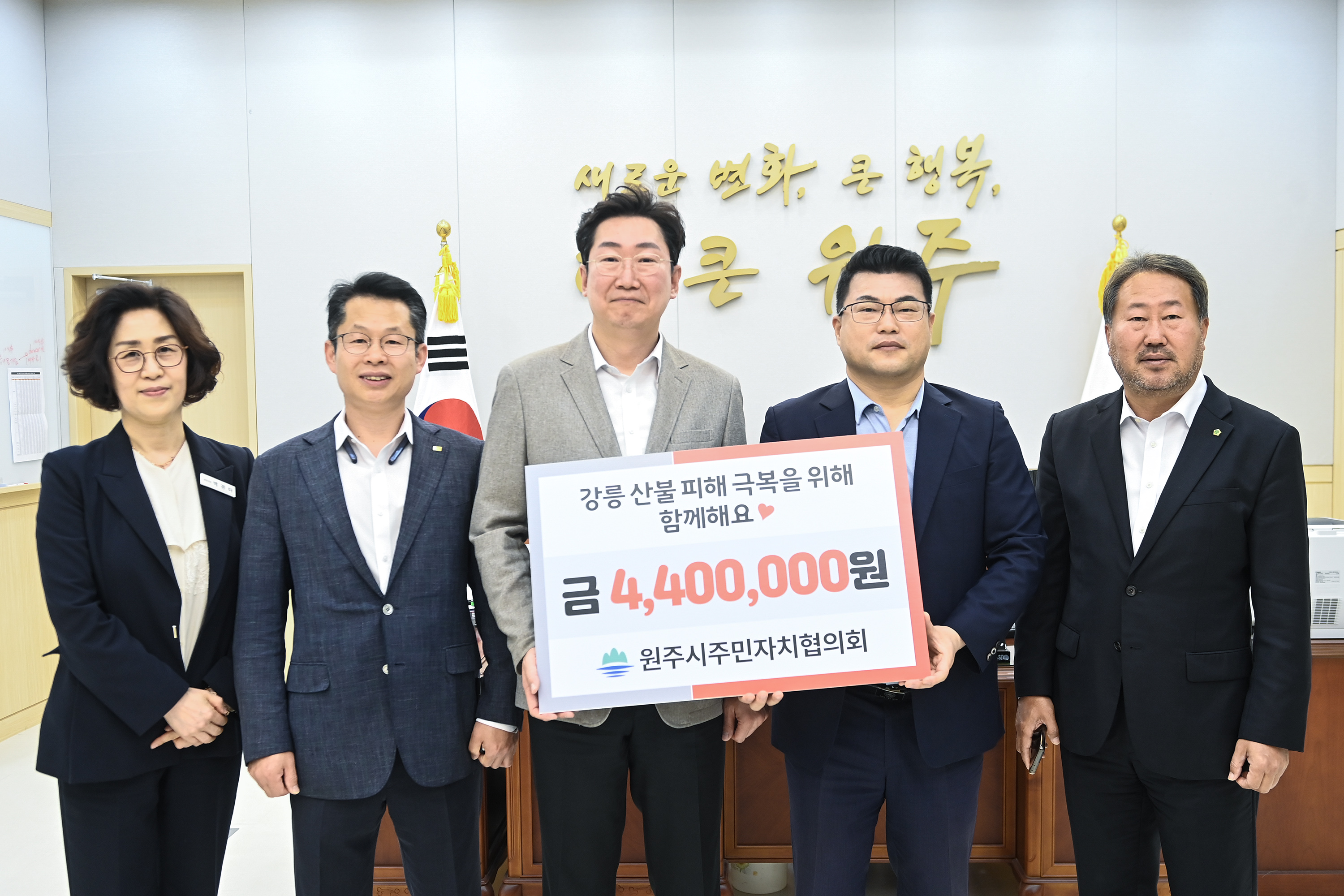 [강원사회복지신문 김도연 기자]=원주시 주민자치협의회(회장 최성우)는 지난 5월 12일 원주시청 시장 집무실을 방문하여 강릉시 산불피해 이재민 지원을 위해 각 읍면동 주민자치위원회에서 모금한 성금 440만 원을 전달했다. 최성우 회장은 "이번 성금 모금이 산불피해 지역 주민들이 아픔을 딛고 조속히 일상으로 돌아가는...