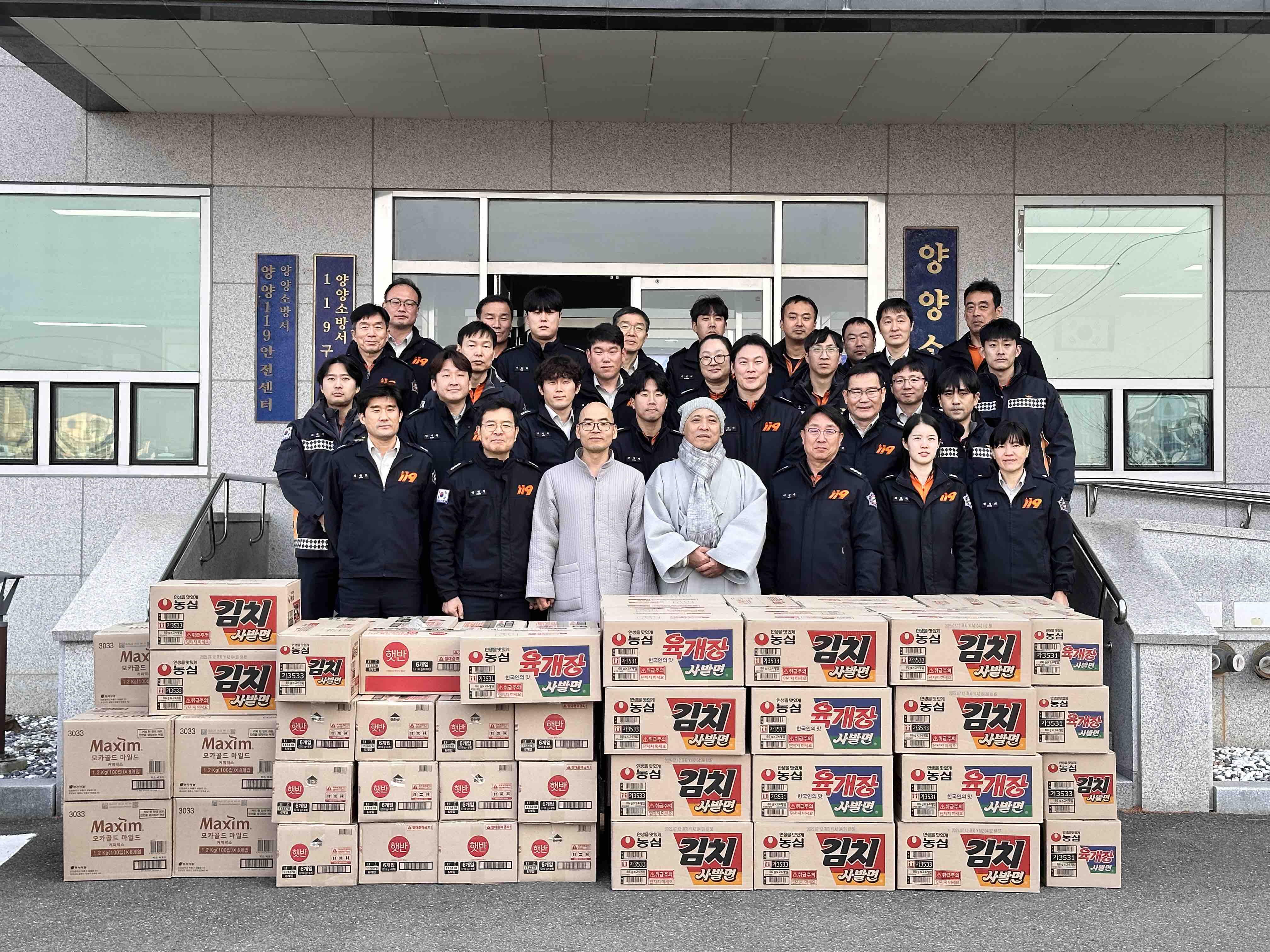 양양소방서(서장 김문하)는 낙산사로부터 지난 1월 21일 격려 간식을 기부받았다고 밝혔다. 낙산사는 겨울철 화재 예방에 노력하는 소방공무원들을 격려하고자 커피 10박스, 컵라면 60박스, 즉석밥 30박스를 준비해 이날 오후 3시 소방서에 전달했다.