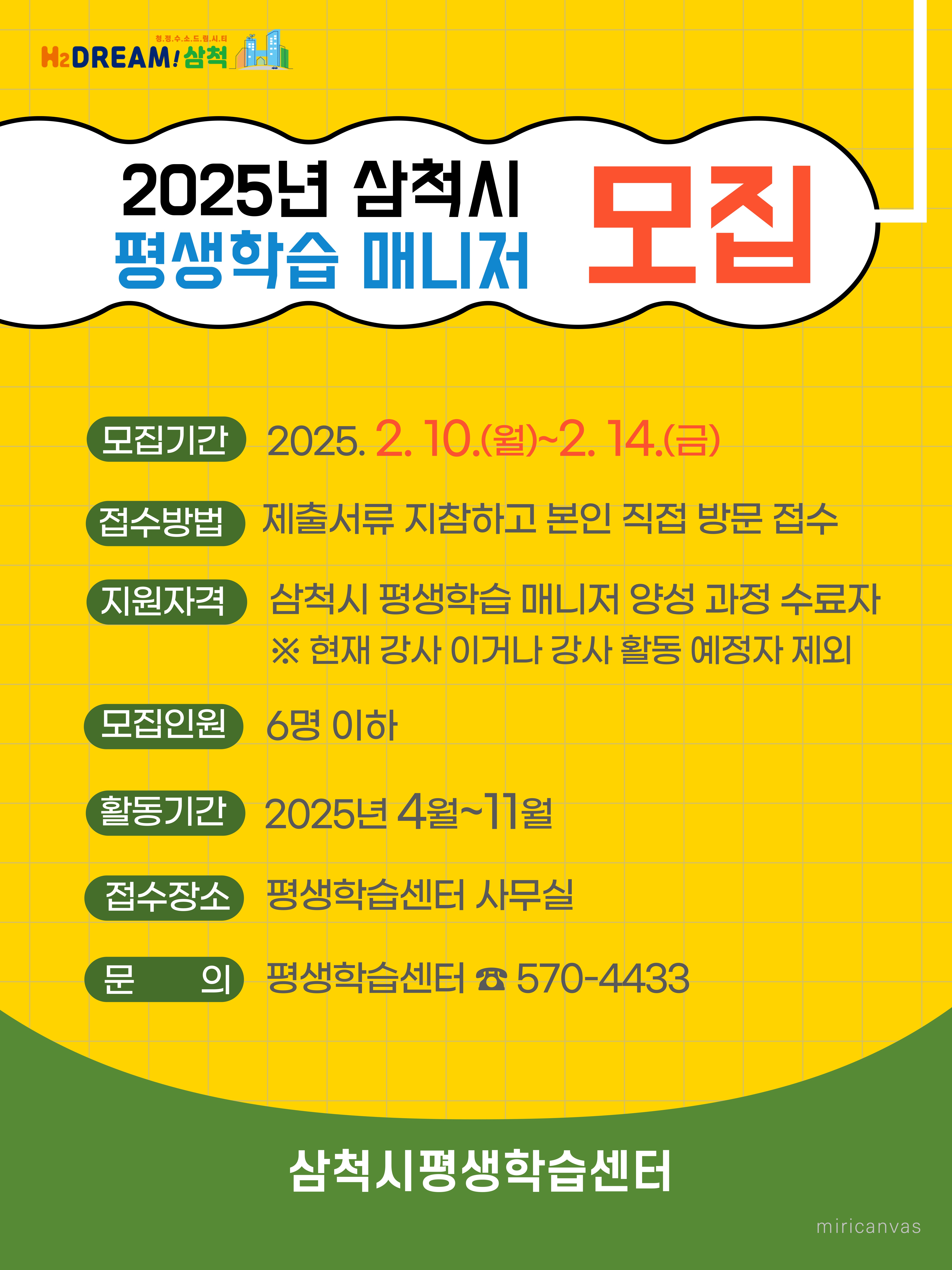 삼척시는 2월 10일(월)부터 14일(금)까지 삼척시 평생학습 매니저 양성 과정 수료자를 대상으로 ‘2025년 삼척시 평생학습 매니저’를 모집한다고 밝혔다. 평생학습 매니저는 삼척시 평생학습이 이루어지는 장소에서 교육 프로그램의 품질 관리와 학습 만족도 증진을 위하여 프로그램 운영·평생학습 상담·홍보 등 학습활동...