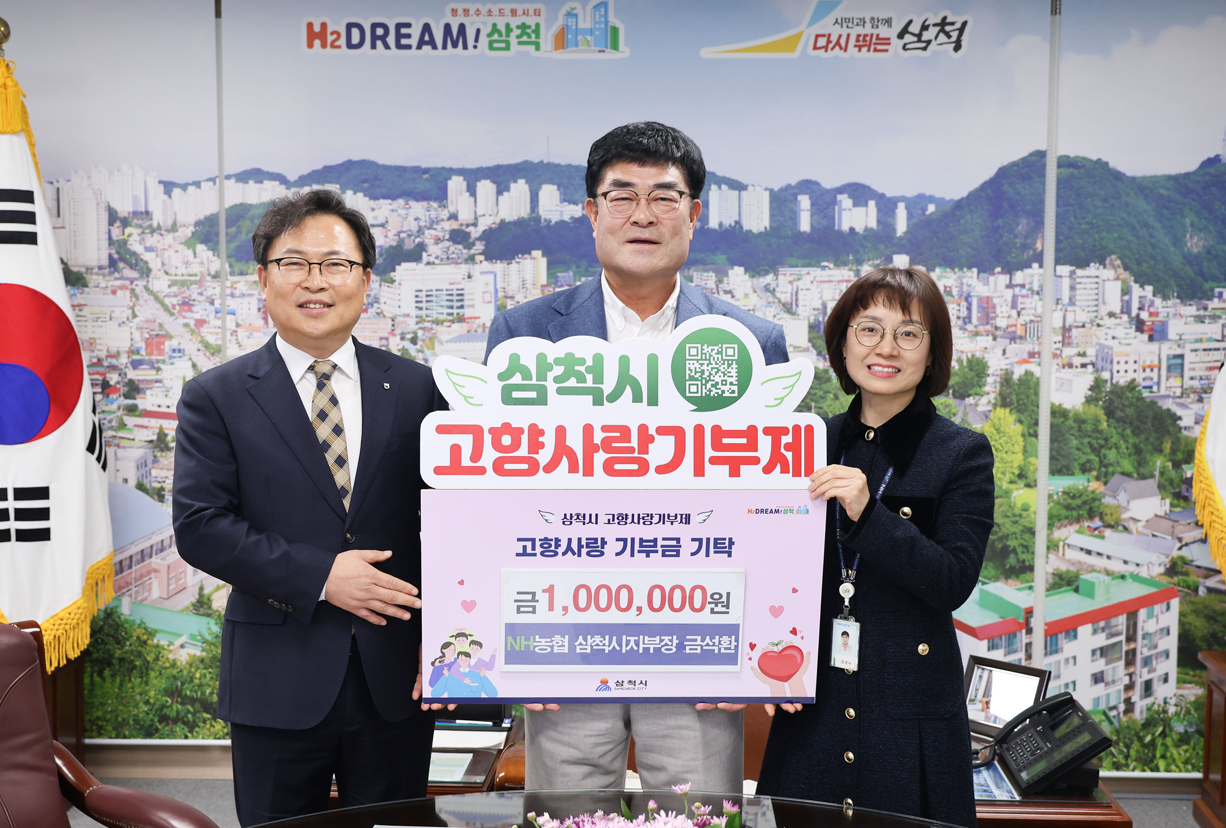 NH농협 삼척시지부 금석환 지부장은 1월 13일 오후 삼척시청을 방문하여 고향사랑기부금 100만원을 전달하였다. 이번 농협 정기 인사발령으로 삼척시에 새로 부임하는 금석환 삼척시지부장은 강릉 출신으로 원주남지점장, 강릉시지부장을 역임했다. 또한, NH농협 삼척시지부는 지역 5개 농축협 조합장 등 임직원들과 함께 농...