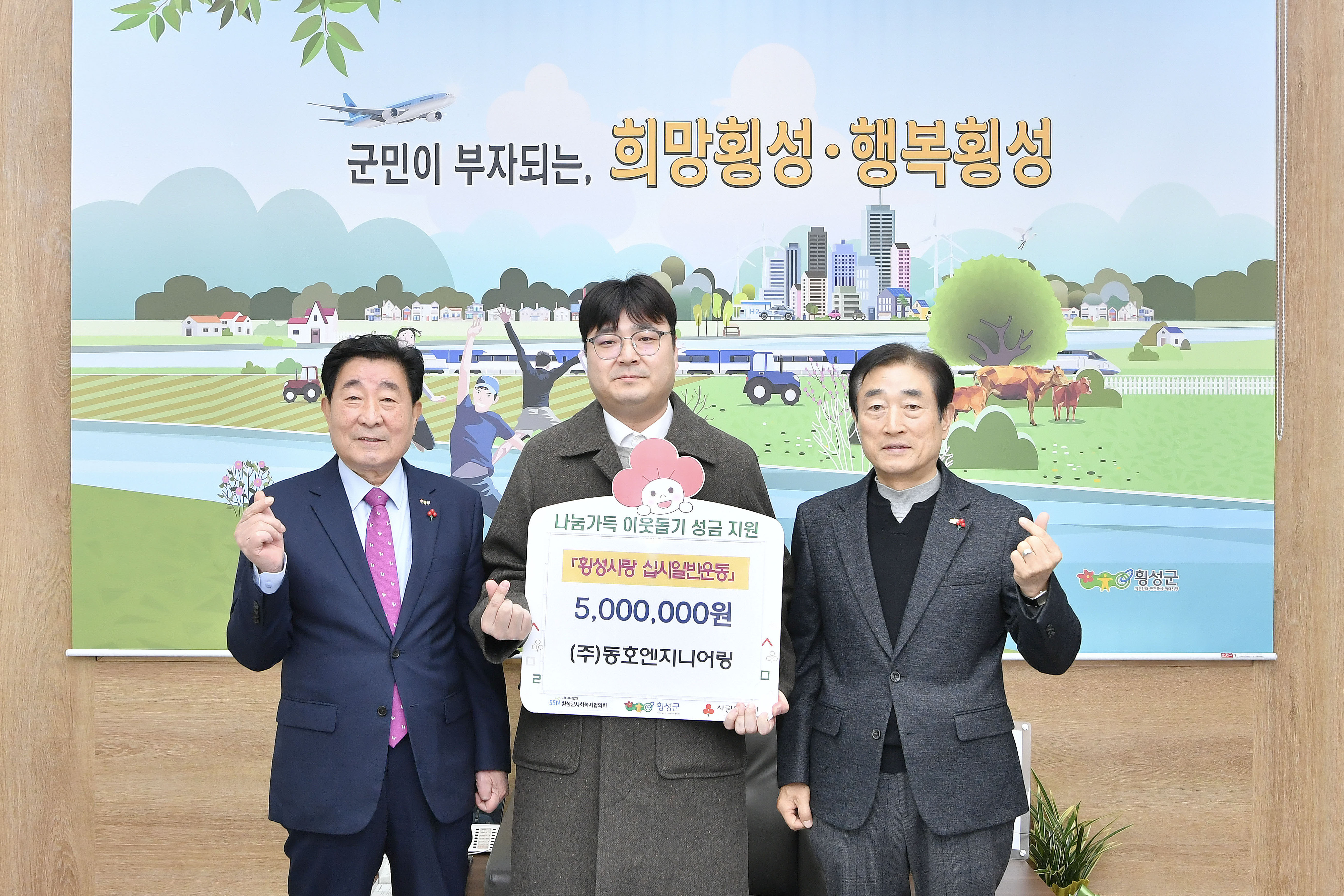 (주)동호엔지니어링(대표 정의권)은 12월 3일 9시 20분 횡성군청을 방문해 이웃돕기 후원금 500만 원을 전달했다.