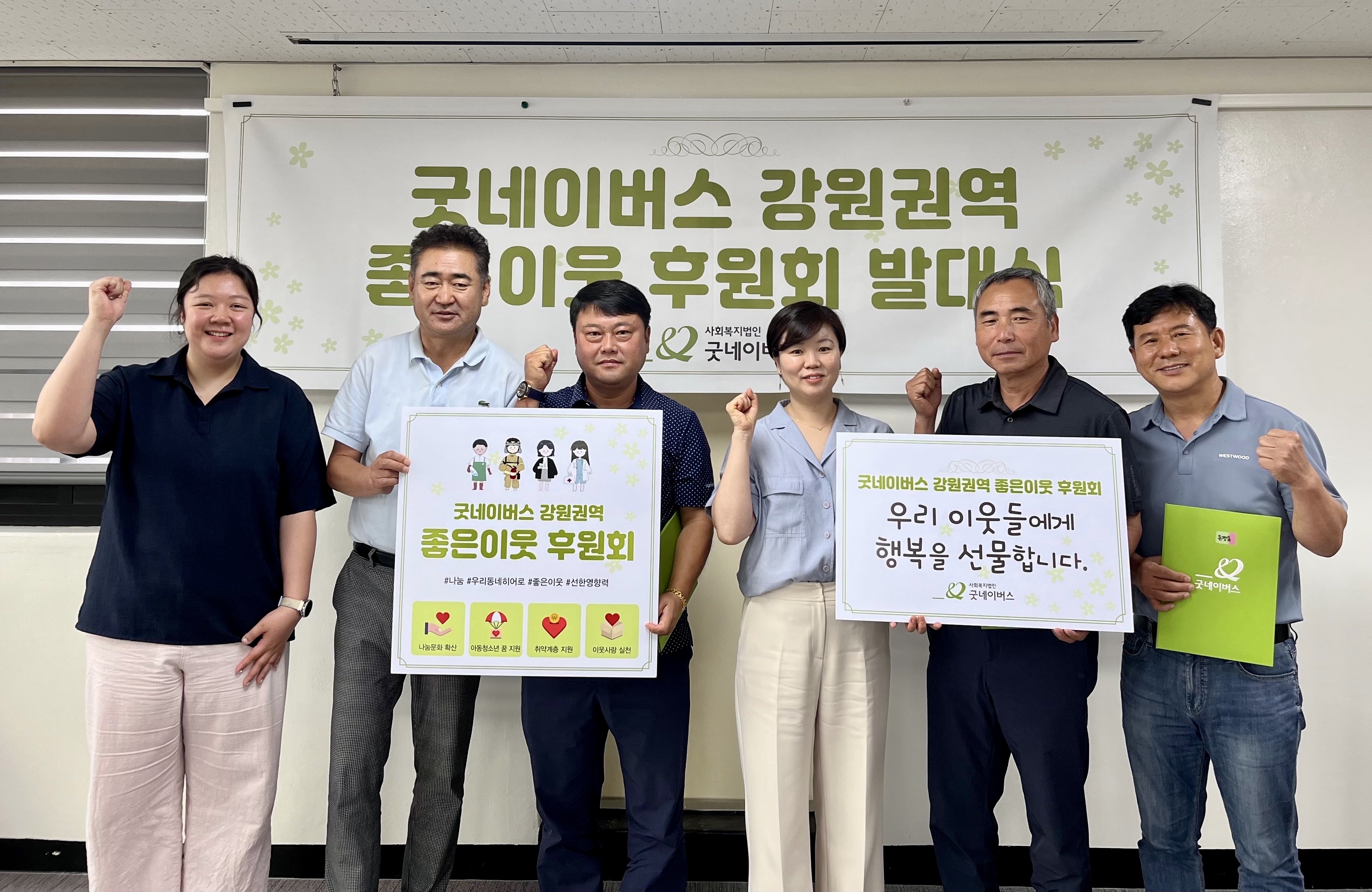 강원권역 좋은이웃후원회, 굿네이버스 대표 나눔캠페인으로 소상공인을 포함해 누구나 참여 가능 굿네이버스 강원서부지부(지부장 박미경)는 한우곱창구다(사장 정민조), ㈜태성로지스(대표 박성우), 늘푸른 건설중기(대표 유경섭), 대광포장건설(주) (대표 김용대)와 함께 좋은이웃 후원회 발대식을 진행했다고 7월 19일(금...