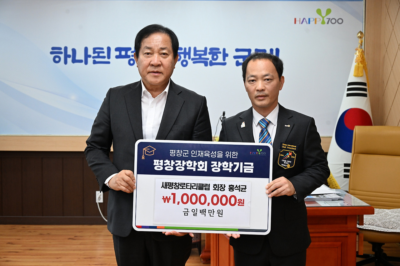 홍석균 새평창로타리클럽 회장은 지난 7월 15일 평창군청을 방문하여 평창장학회에 장학금 1백만 원을 기탁했다. 홍석균 회장은 “평창군 학생들의 성장을 돕고 지역 인재 육성에 보탬이 되고자 장학금을 기부하게 되었다.”라며 “이 장학금이 학생들이 희망찬 미래를 만들어 나가는 데 보탬이 되길 바란다.”라며 기탁 취지...