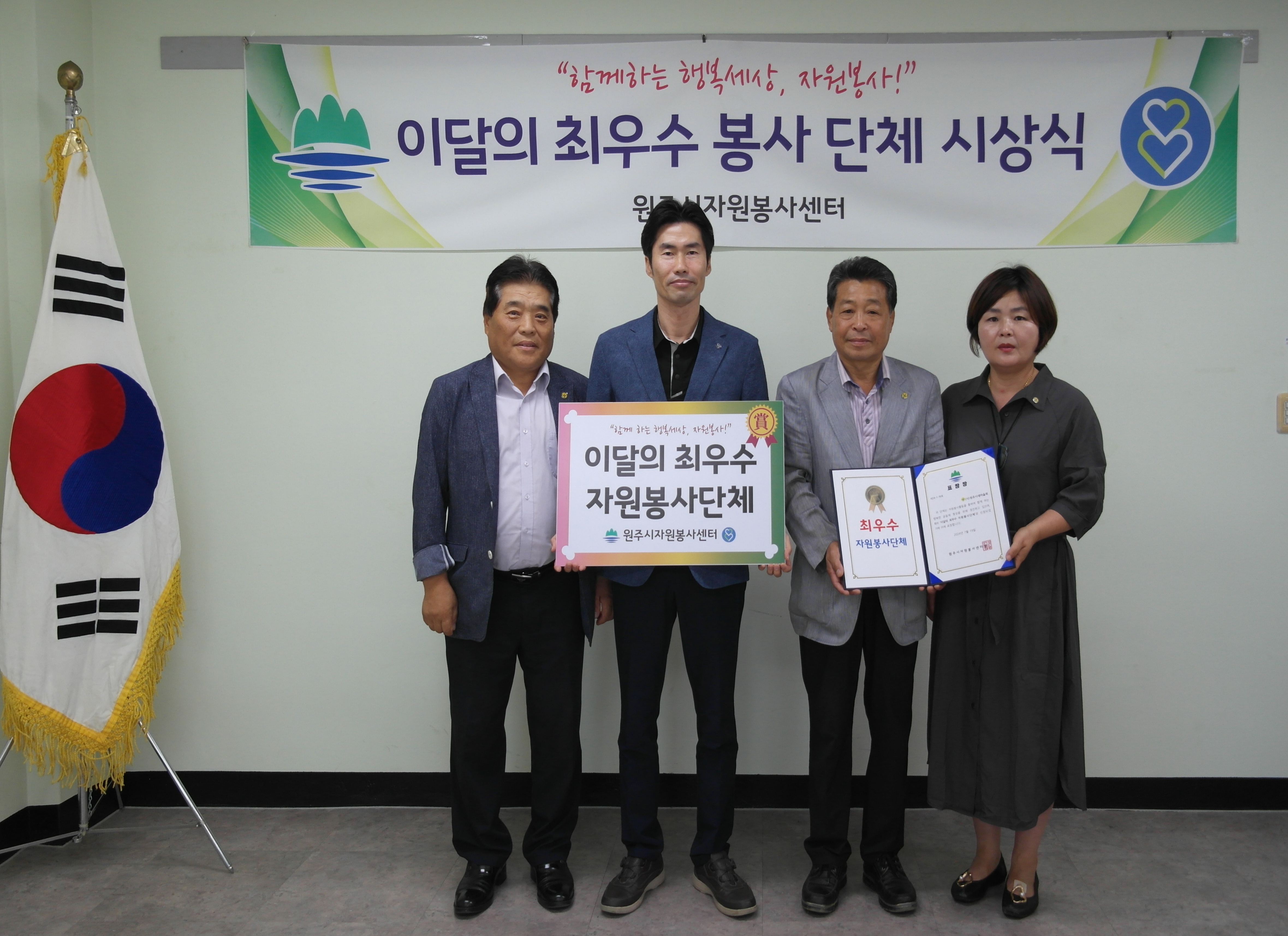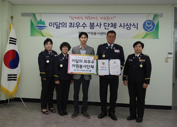 원주시자원봉사센터는 7월 19일, 원주시자원봉사센터 회의실에서 이달의 최우수 자원봉사단체로 사단법인 원주시새마을회를 선정하고 시상했다. 새마을회는 사회복지, 지역발전, 재난복구, 행사지원, 환경보전 등의 다양한 자원봉사 활동을 펼치고 있습니다.
