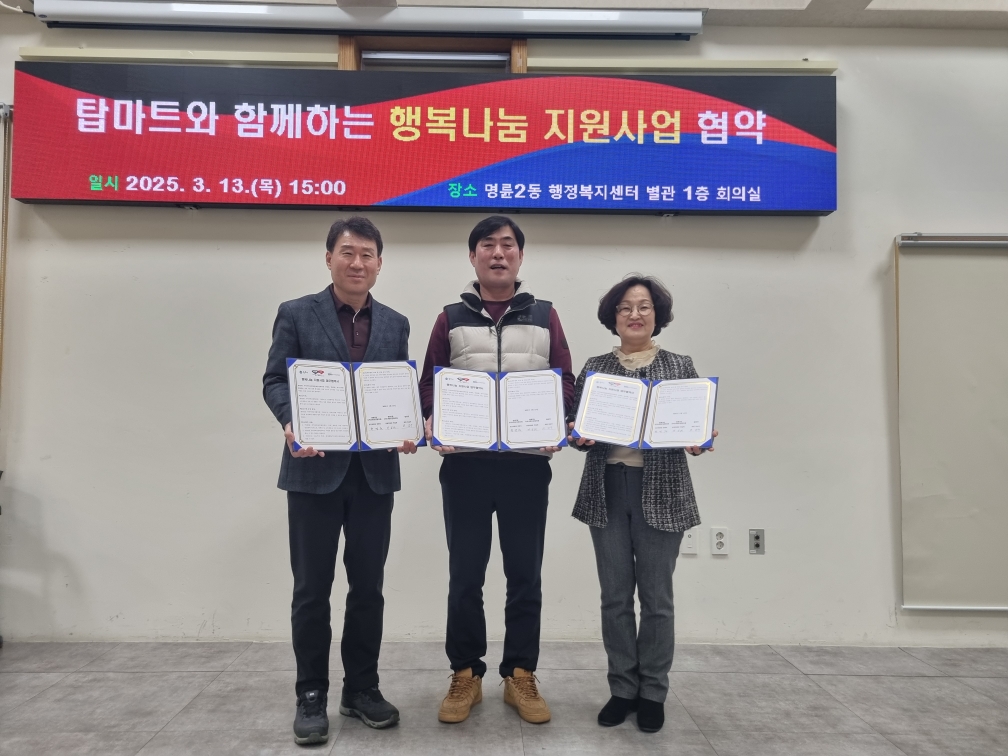 저소득 소외계층 식품, 생필품 지원 원주시 명륜2동 지역사회보장협의체(민간위원장 권영숙, 공공위원장 연길희)는 지난 3월 13일 명륜2동 행정복지센터에서 탑마트(대표 최성우)와 저소득 소외계층을 위한 ‘행복나눔 지원사업’ 업무 협약식을 개최했다. 이번 협약으로 탑마트는 저소득층 독거노인과 장애인 가구에 대한 식...