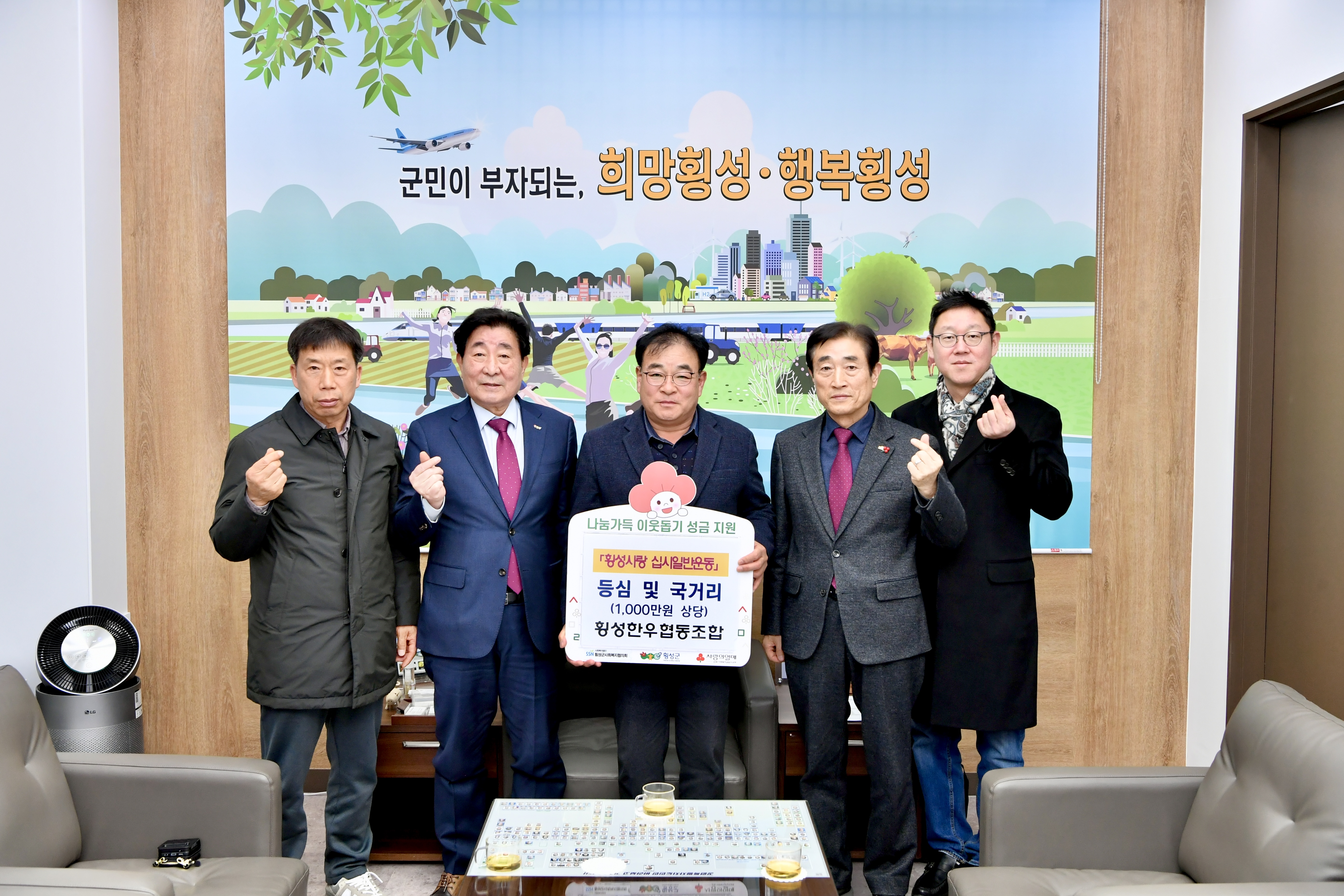 횡성한우협동조합(이사장 장영수)은 2월 20일 16시 50분 횡성군청을 방문해 등심 500g 100개, 국거리 500g 200개 총1,000만원 상당의 물품을 기탁했다.