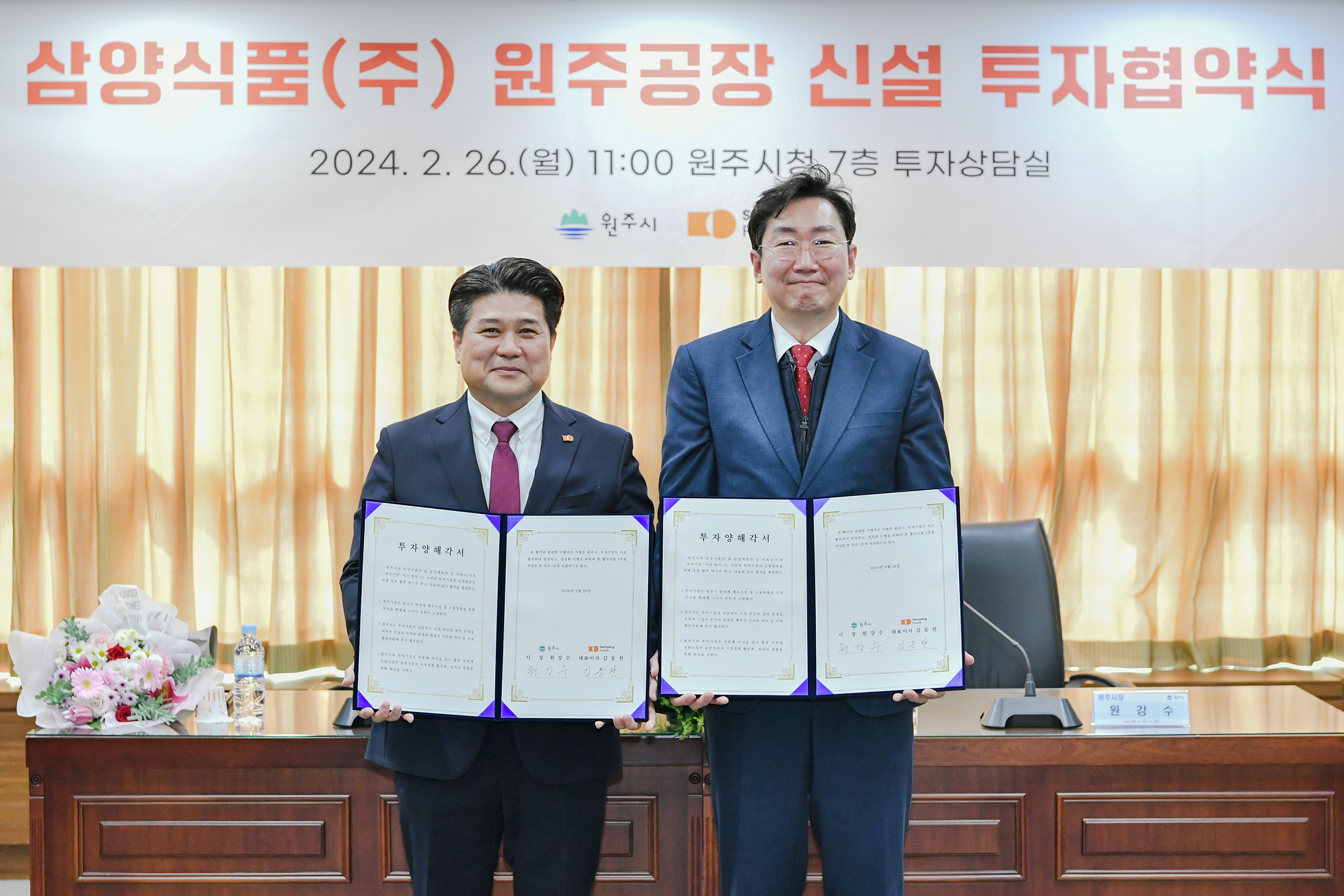 원주시는 지난 2월 26일 시청 7층 투자상담실에서 원주 대표 향토기업인 삼양식품(주)과 공장 신설 투자를 위한 투자협약을 체결했다. 이날 투자협약식에는 원강수 원주시장과 김동찬 삼양식품(주) 대표이사, 기업 관계자 등이 참석했다. 이번 투자협약을 통해 삼양식품(주)은 2025년 상반기까지 우산동 기존 생산공장 인근 ...
