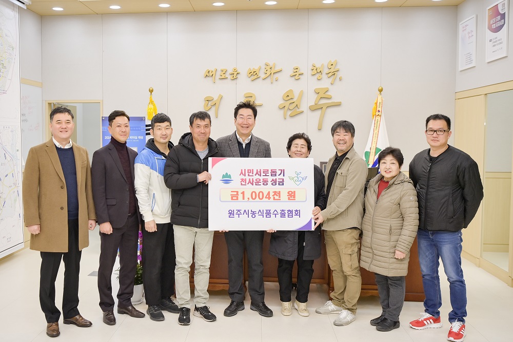 1,004천 원의 천사운동 후원금 전달 차상위계층(370세대)에 월 18만원씩 생계비 지원 등 원주농식품수출협회(회장 안준민)는 29일 오전 9시 시장 집무실에서 천사운동 후원금 1,004천 원을 기탁했다. 이날 전달식에는 안준민 회장 외 김봉현 부회장, 김기석, 문승욱, 최승영, 김원호, 이동보, 조재숙, 정연주, 박현철 회원이...