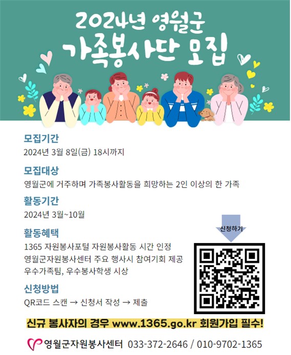 영월군자원봉사센터는 봉사를 통해 건강하고 행복한 가족을 만들기 위한 '2024년도 영월군 가족봉사단'을 모집한다. 가족봉사단은 3월 발대식을 갖고 4월부터 본격적으로 활동하게 되며, 가족봉사단으로 활동 시 1365 자원봉사포털 봉사활동 시간 인정, 활동 지원, 다양한 프로그램 운영과 우수가족팀, 우수봉사학생 시상 등...