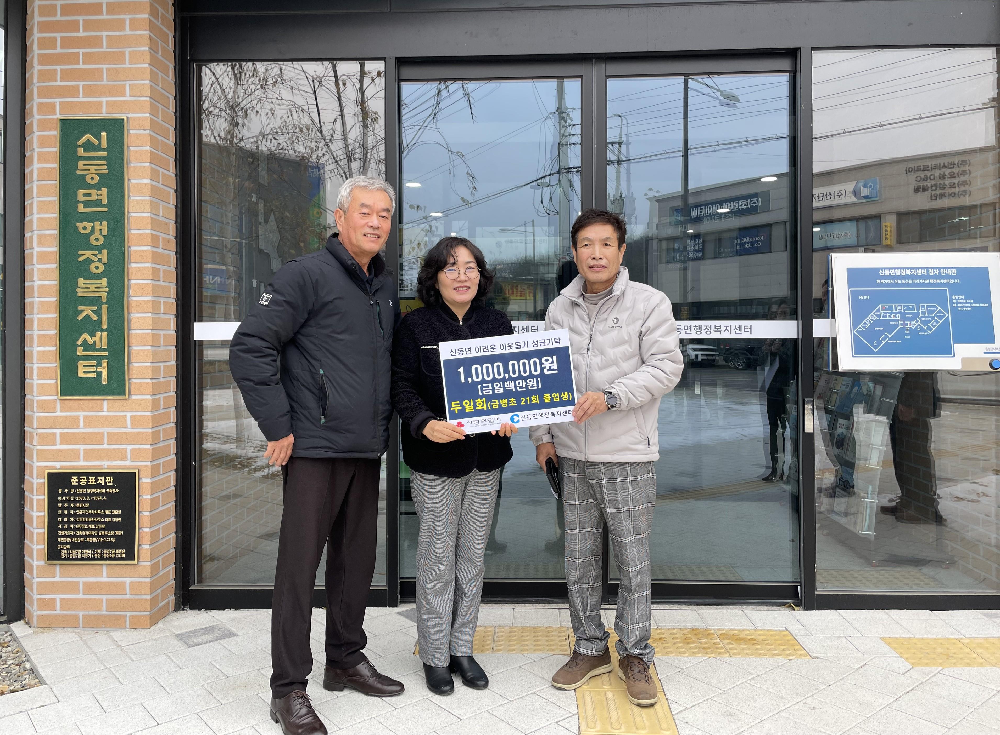 춘천시 신동면 금병초 21회 졸업생 모임인 ‘두일회(회장 진화균)’는 지난 12월 30일 신동면 행정복지센터(면장 진정애)를 방문해 성금 100만 원을 전달했다.