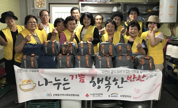 춘천시 신북읍 지역사회보장협의체(위원장 김신림)는 지난 8월 22일 강원사회복지공동모금회와 K-water 소양강댐지사의 후원을 받아 신북읍 행정복지센터(읍장 홍미순)에서 독거노인 및 저소득가정 등 41가구에 전달할 반찬을 조리하고 전달했다.