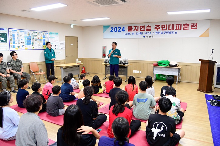 화천군은 지난 8월 22일 오후 2시 군청을 비롯한 전역에서 2024 을지연습 민방공 주민대피훈련을 실시했다. 최문순 화천군수가 하남면 원천리 주민대피시설을 찾아 주민들에게 훈련상황을 설명하고 있다.